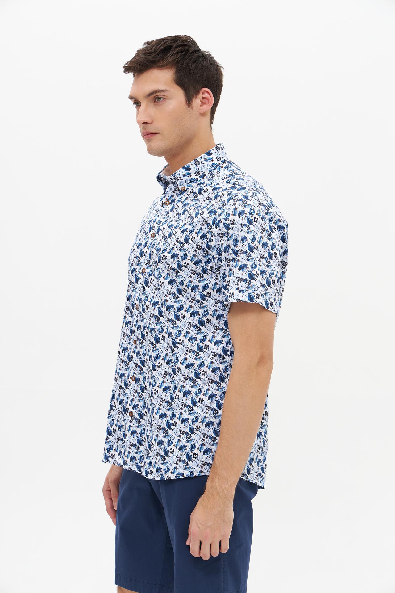 - Стильный принт: Рубашка украшена выразительным узором из листьев и цветов в различных оттенках синего и голубого на светлом фоне. Этот свежий и динамичный дизайн добавит индивидуальности вашему летнему образу.