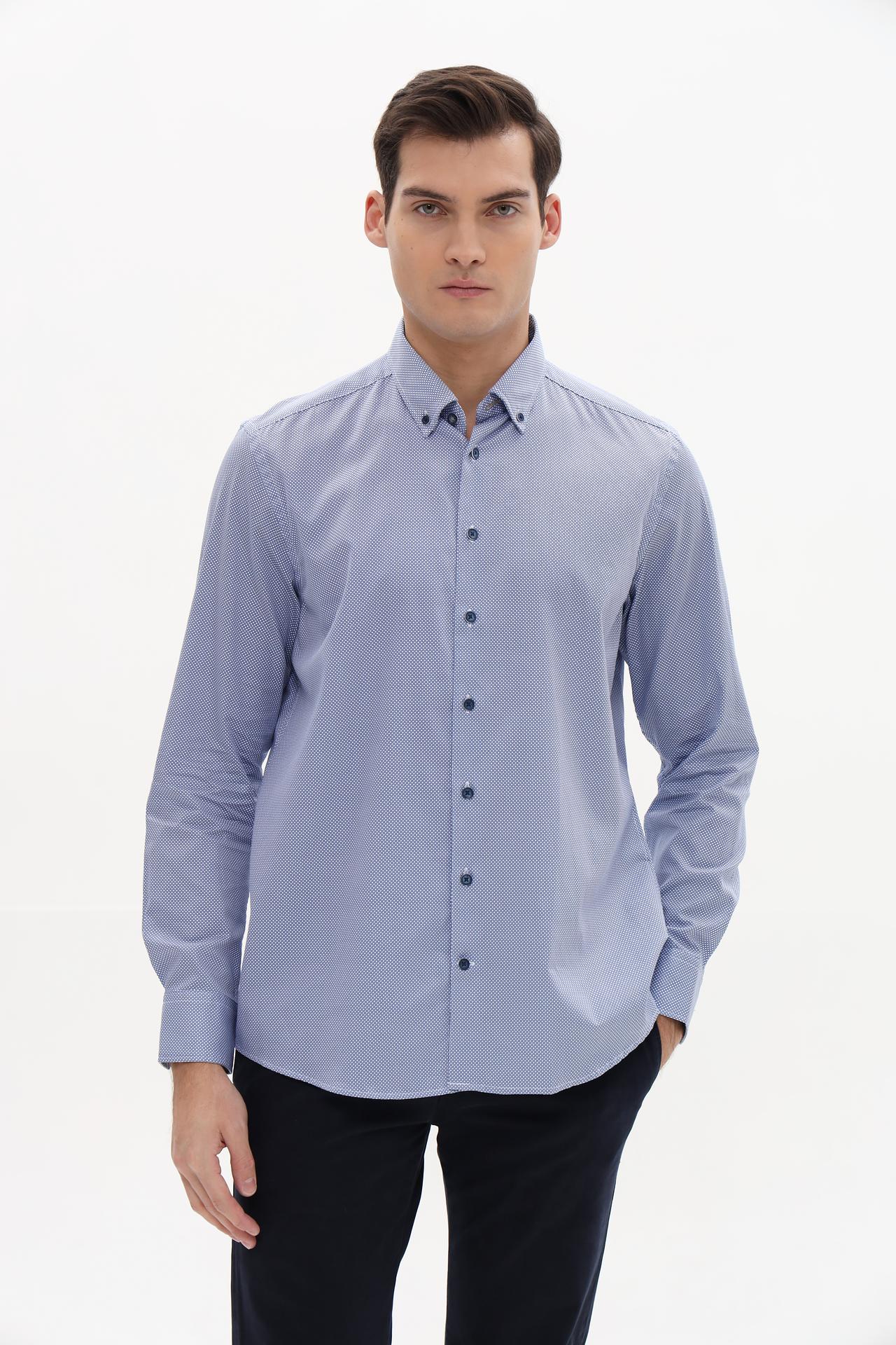 Универсальный голубой цвет с деликатным принтом делает эту рубашку отличным дополнением к вашему гардеробу. Сочетайте её с брюками чинос, джинсами или шортами для создания разнообразных стильных образов.