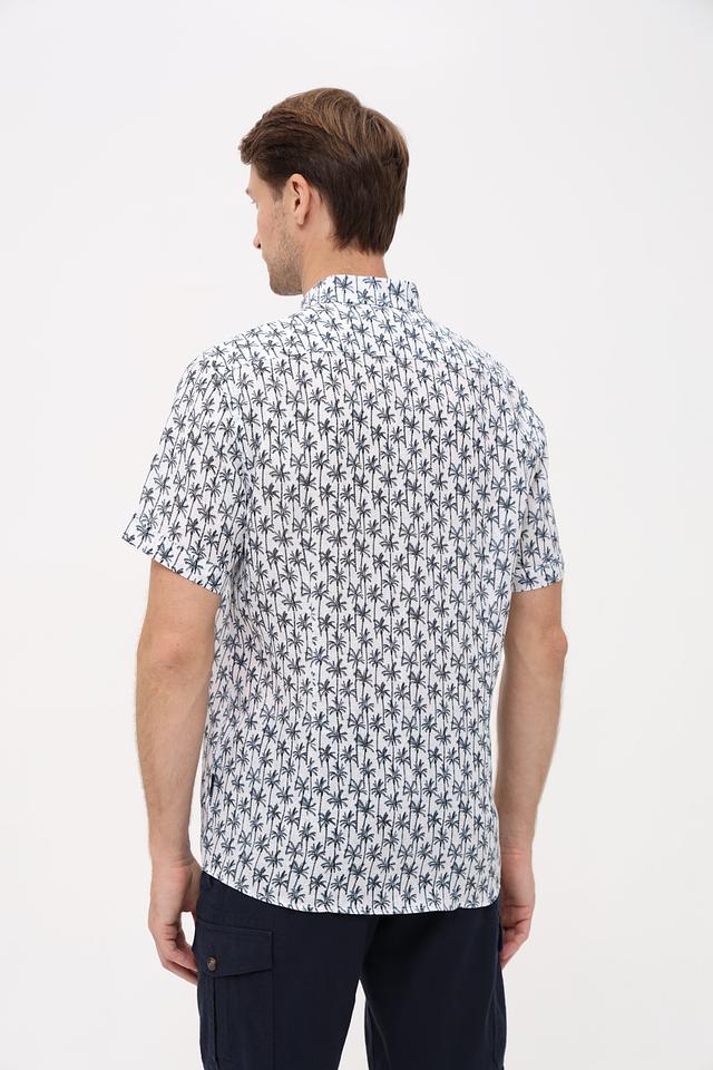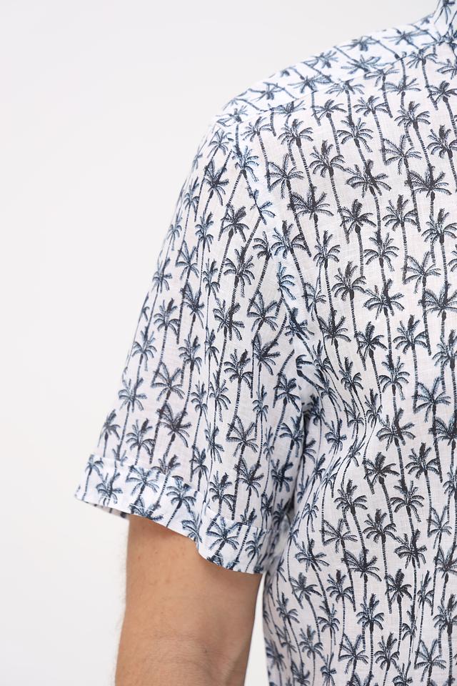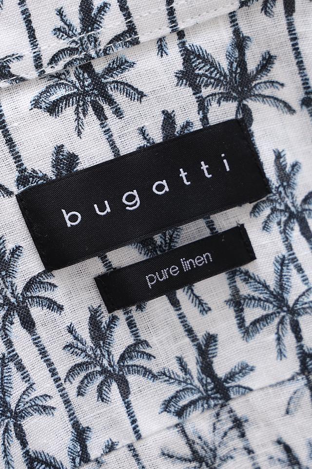 Мужская рубашка Bugatti белого цвета с оригинальным принтом в виде пальмовых листьев. Изготовлена из 100% льна, что обеспечивает комфорт и воздухопроницаемость в жаркую погоду. Состав: лен 100%