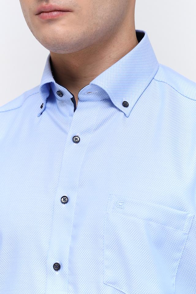 Рубашка имеет классический воротник, манжеты на пуговицах и нагрудный карман. Тёмные пуговицы контрастируют с голубым цветом ткани, добавляя рубашке элегантности. Текстура ткани с мелким рисунком придает рубашке дополнительный интерес.