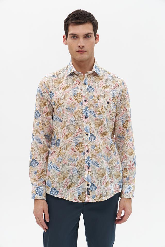 Эта стильная мужская рубашка от Casa Moda выполнена в светло-бежевом цвете и украшена ярким тропическим принтом с изображением листьев и цветов.