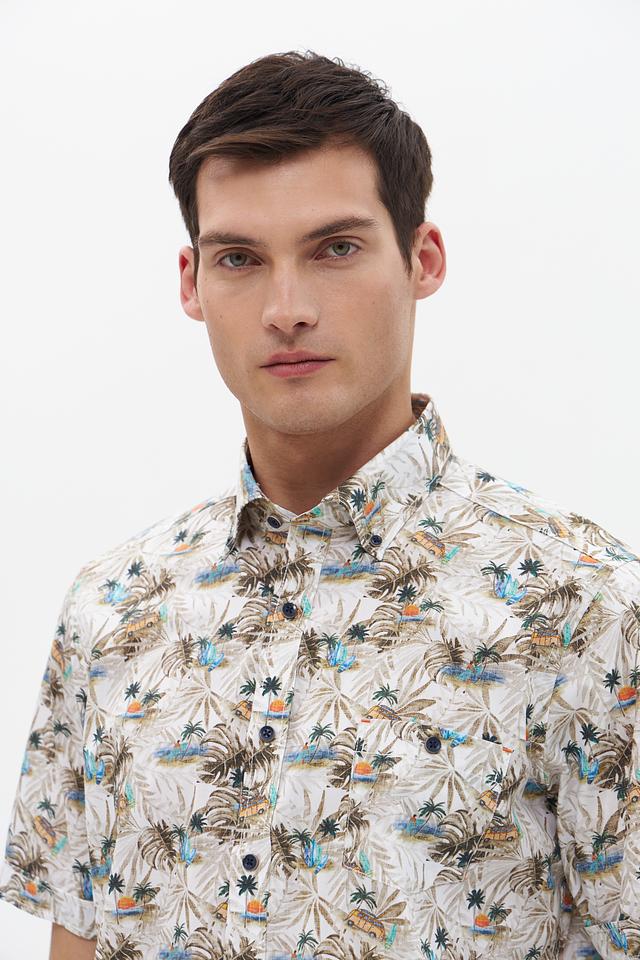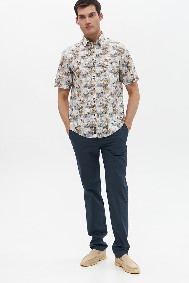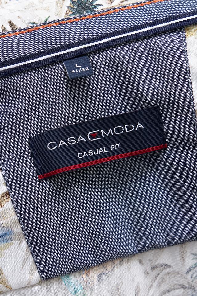 Мужская рубашка Casa Moda с коротким рукавом, выполненная в бежевом цвете с ярким тропическим принтом. Изготовлена из 100% хлопка, обеспечивающего комфорт и воздухопроницаемость. Состав: хлопок 100%