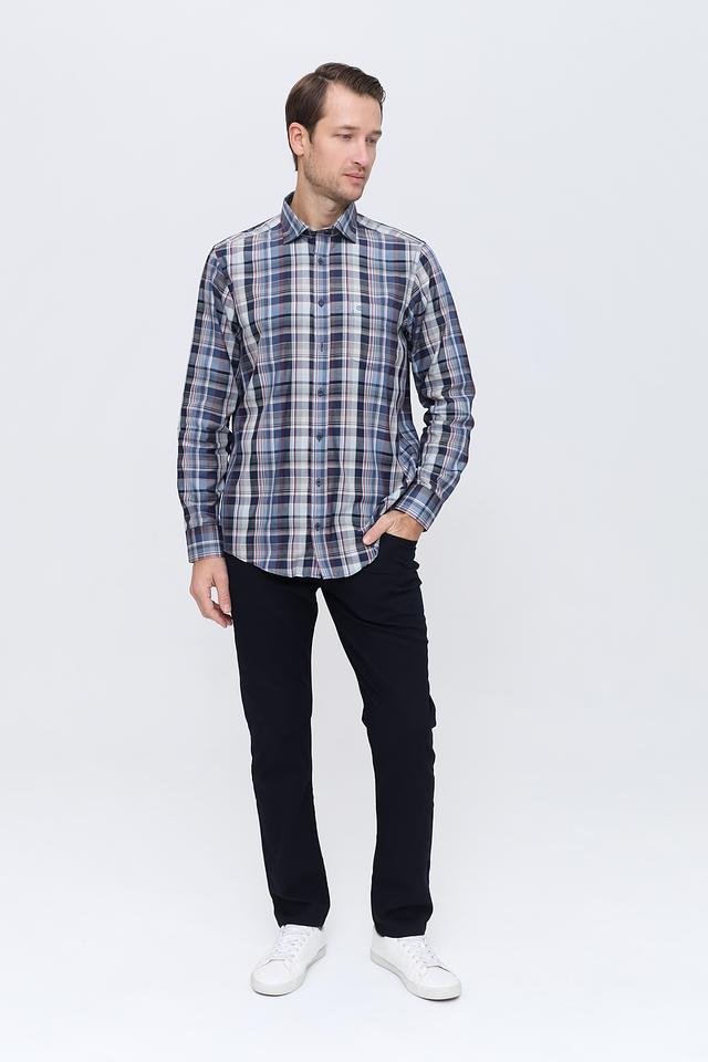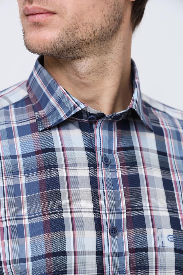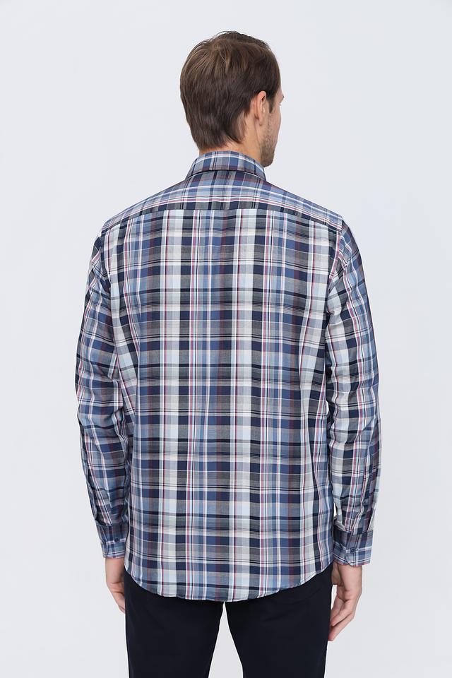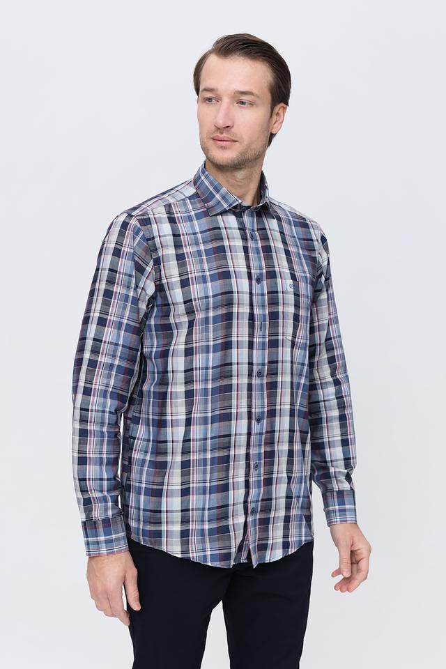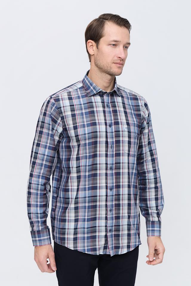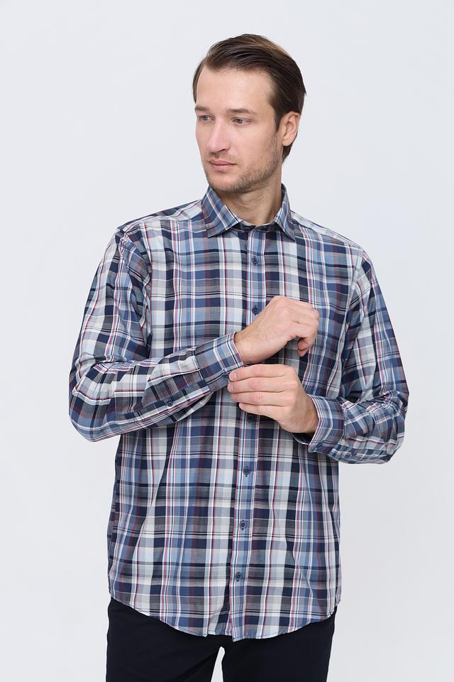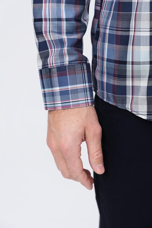 Рубашка имеет классический крой и длинные рукава. Её отличает стильный клетчатый рисунок в синих, белых и бордовых тонах, который придаёт ей элегантный и современный вид. Воротник рубашки выполнен в классическом стиле, что позволяет носить её с галстуком или без.