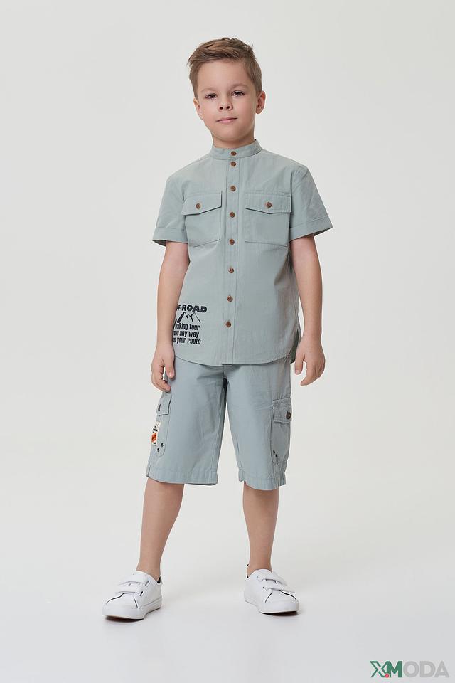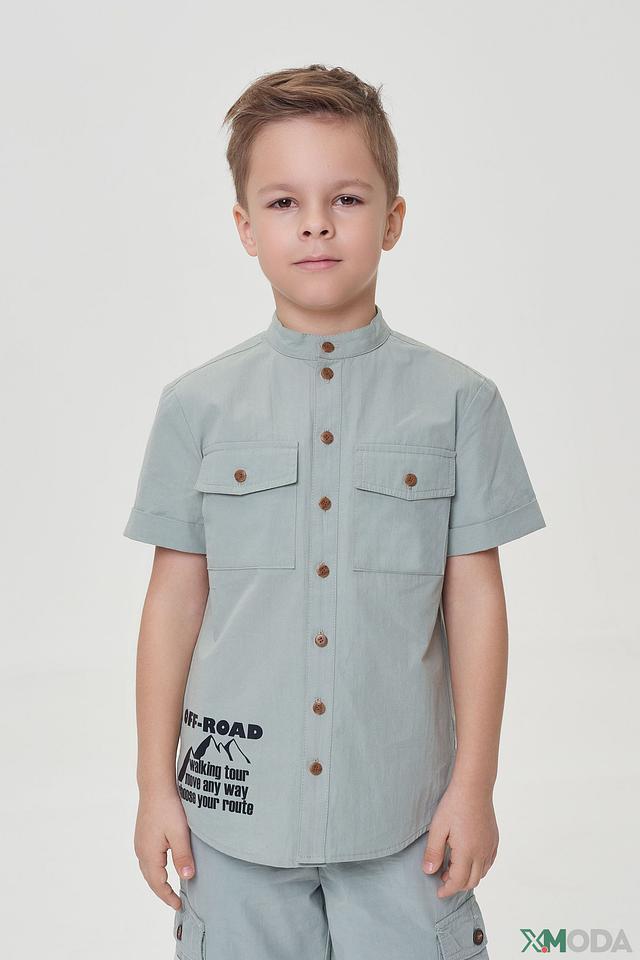 Рубашка имеет короткие рукава и удобный крой, не сковывающий движения. Воротник-стойка придает ей особый стиль. На передней части рубашки расположен яркий принт с изображением гор и надписью "OFF-ROAD", что подчеркивает ее активный характер.