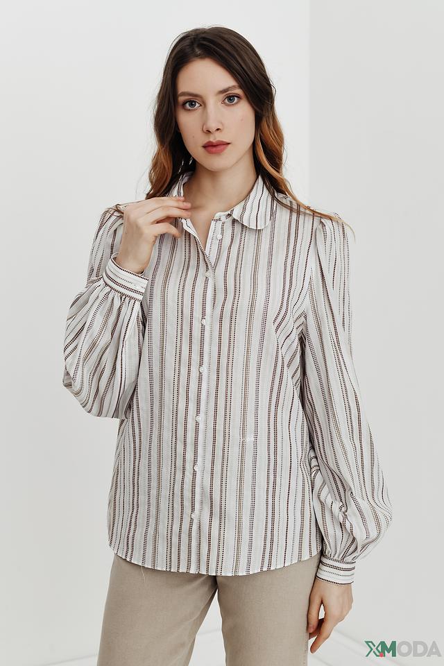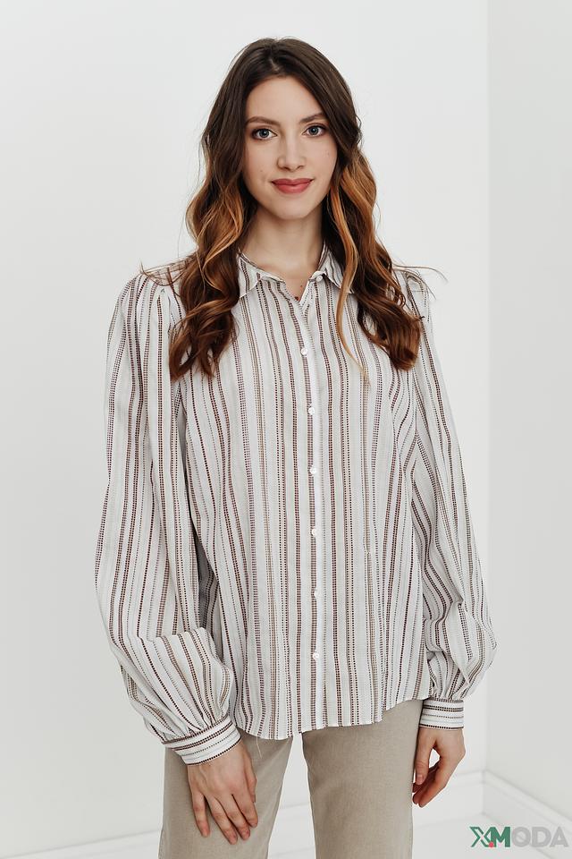 Рубашка имеет классический крой с отложным воротником и застежкой на пуговицы. Особый акцент сделан на рукавах-фонариках, которые придают образу романтичность и женственность. Модель выполнена из высококачественного 100% хлопка, что обеспечивает комфорт в носке и приятные тактильные ощущения.