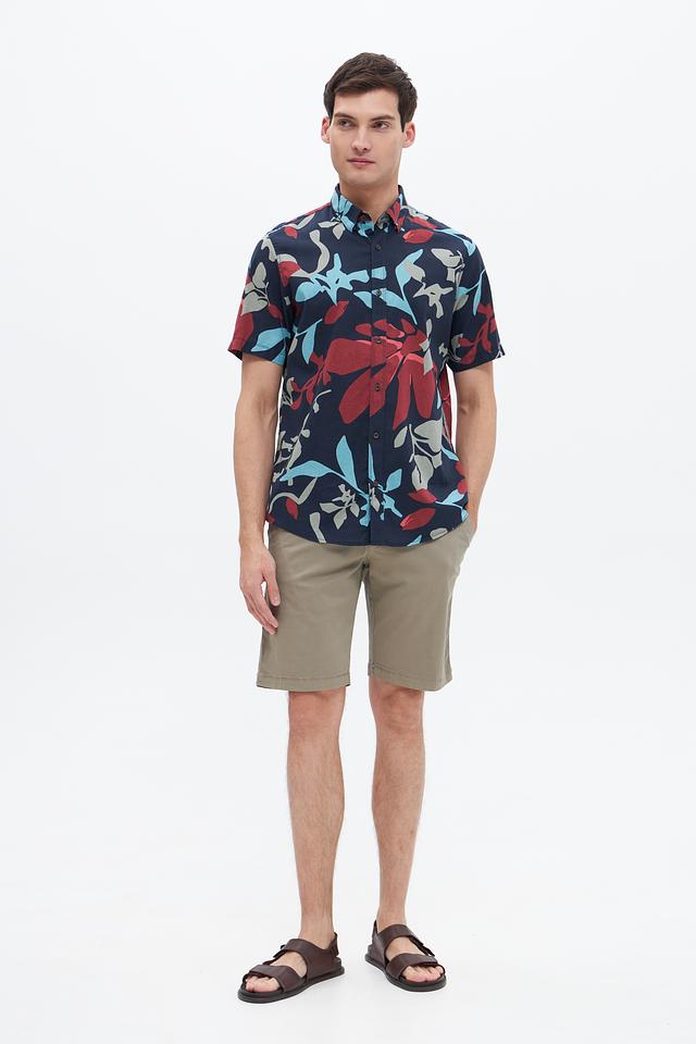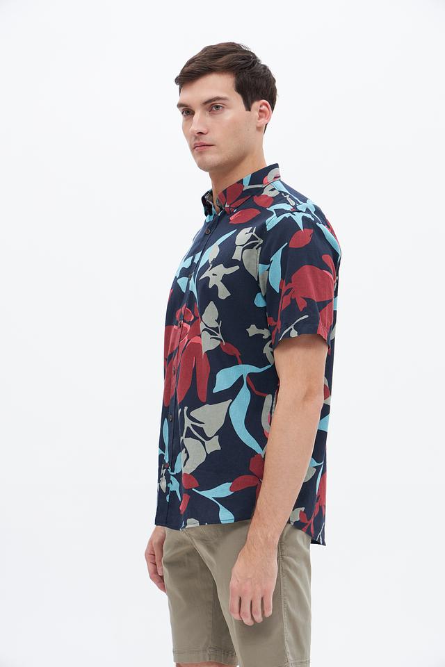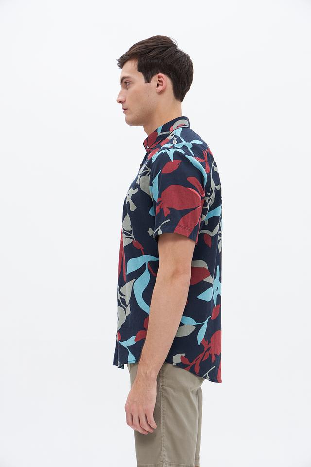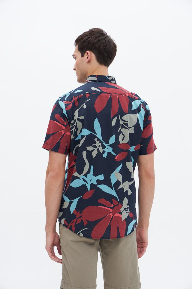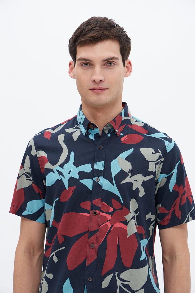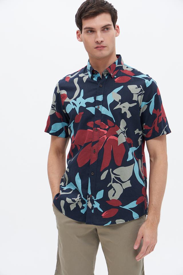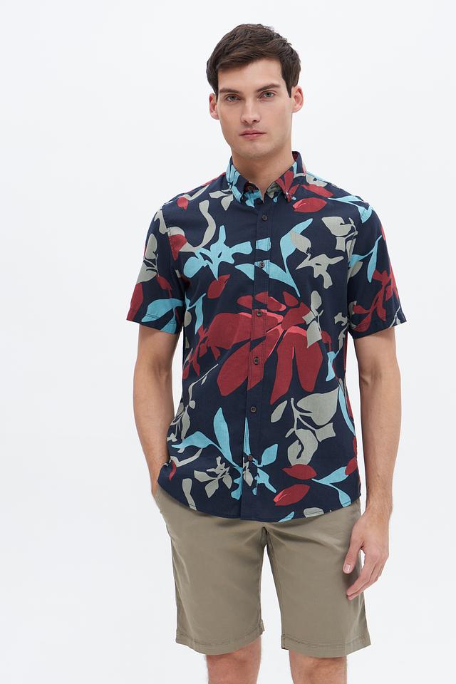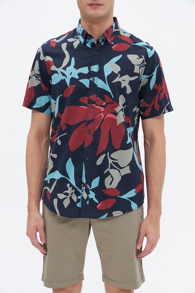 Мужская рубашка Lerros короткого рукава тёмно-синего цвета с ярким цветочным принтом. Изготовлена из натурального хлопка с добавлением льна, что обеспечивает комфорт и воздухопроницаемость в жаркую погоду. Состав: хлопок 80%, лен 20%