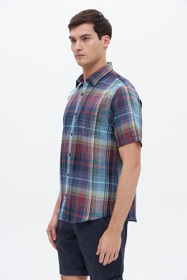 Застежка на пуговицы обеспечивает надежную фиксацию, а короткие рукава делают рубашку идеальным выбором для теплой погоды. Состав ткани: хлопок 71%, лен 29%.