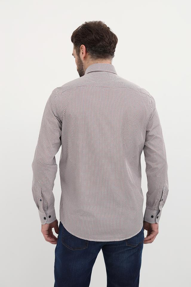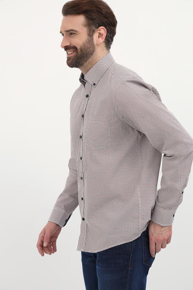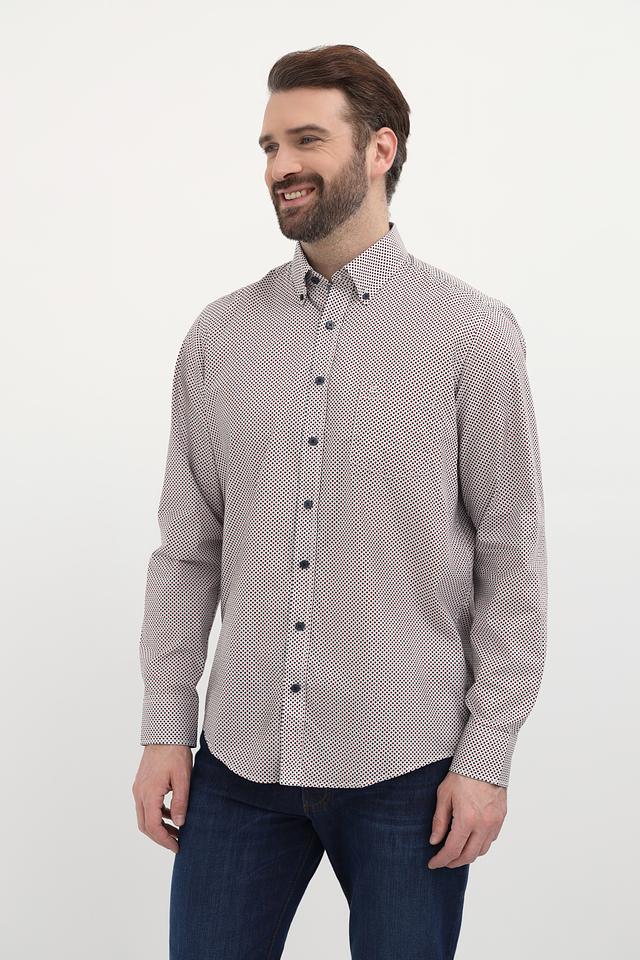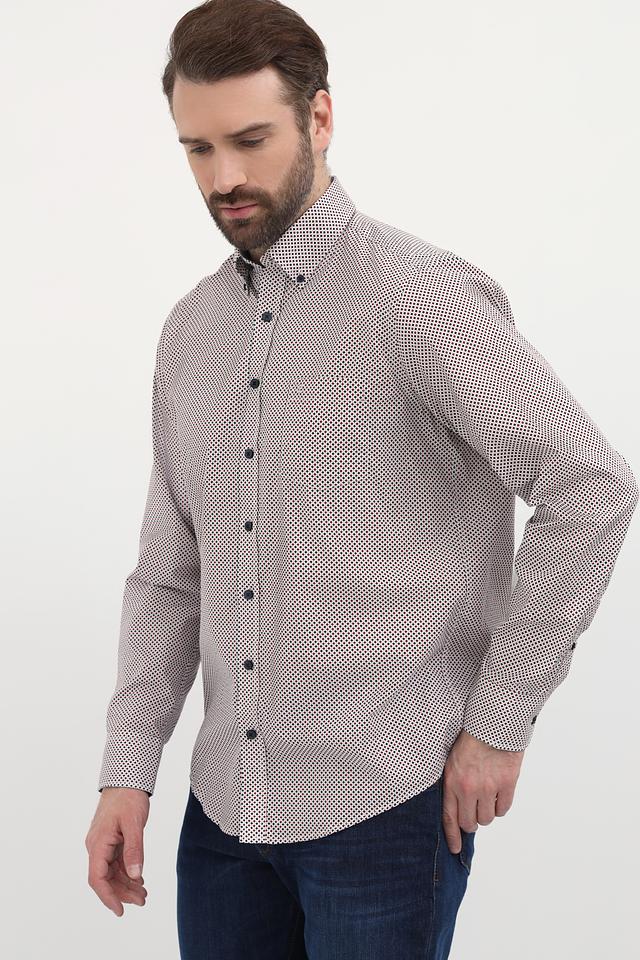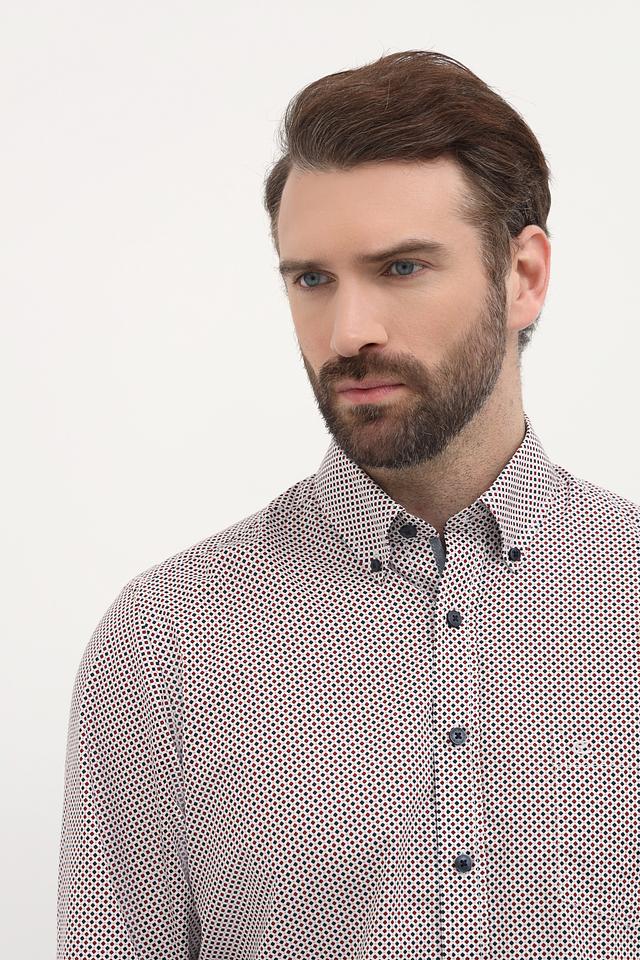 Рубашка имеет классический крой с длинными рукавами и стандартной посадкой. Её отличает оригинальный принт в мелкий рисунок, выполненный в сочетании бежевого и тёмно-синего цветов. Воротник рубашки выполнен в классическом стиле, а пуговицы подобраны в тон рисунку.