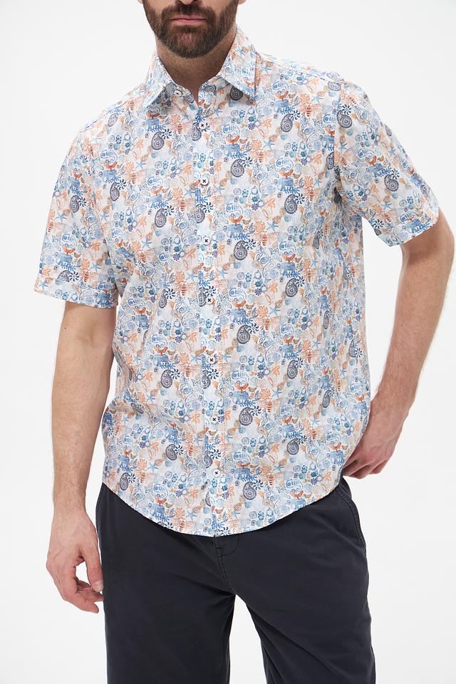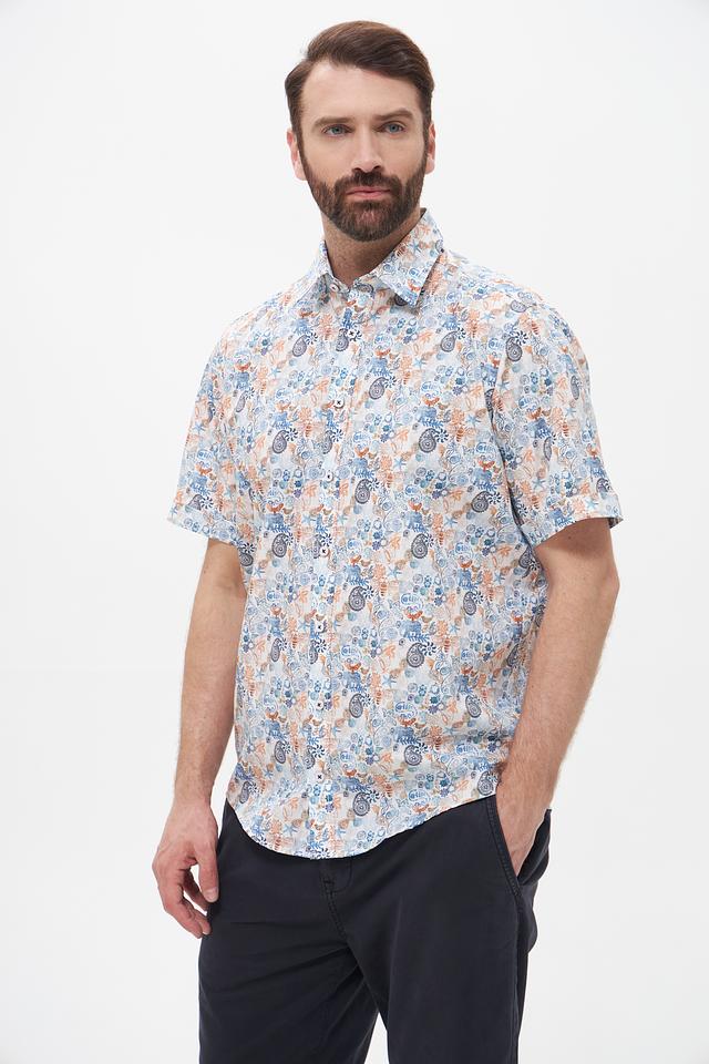 Особенностью данной модели является яркий и оригинальный цветочный принт, выполненный в голубых, оранжевых и белых тонах. Такой рисунок добавит вашему образу свежести и индивидуальности. Классический крой рубашки подходит для различных типов фигуры и легко сочетается с другими элементами гардероба.