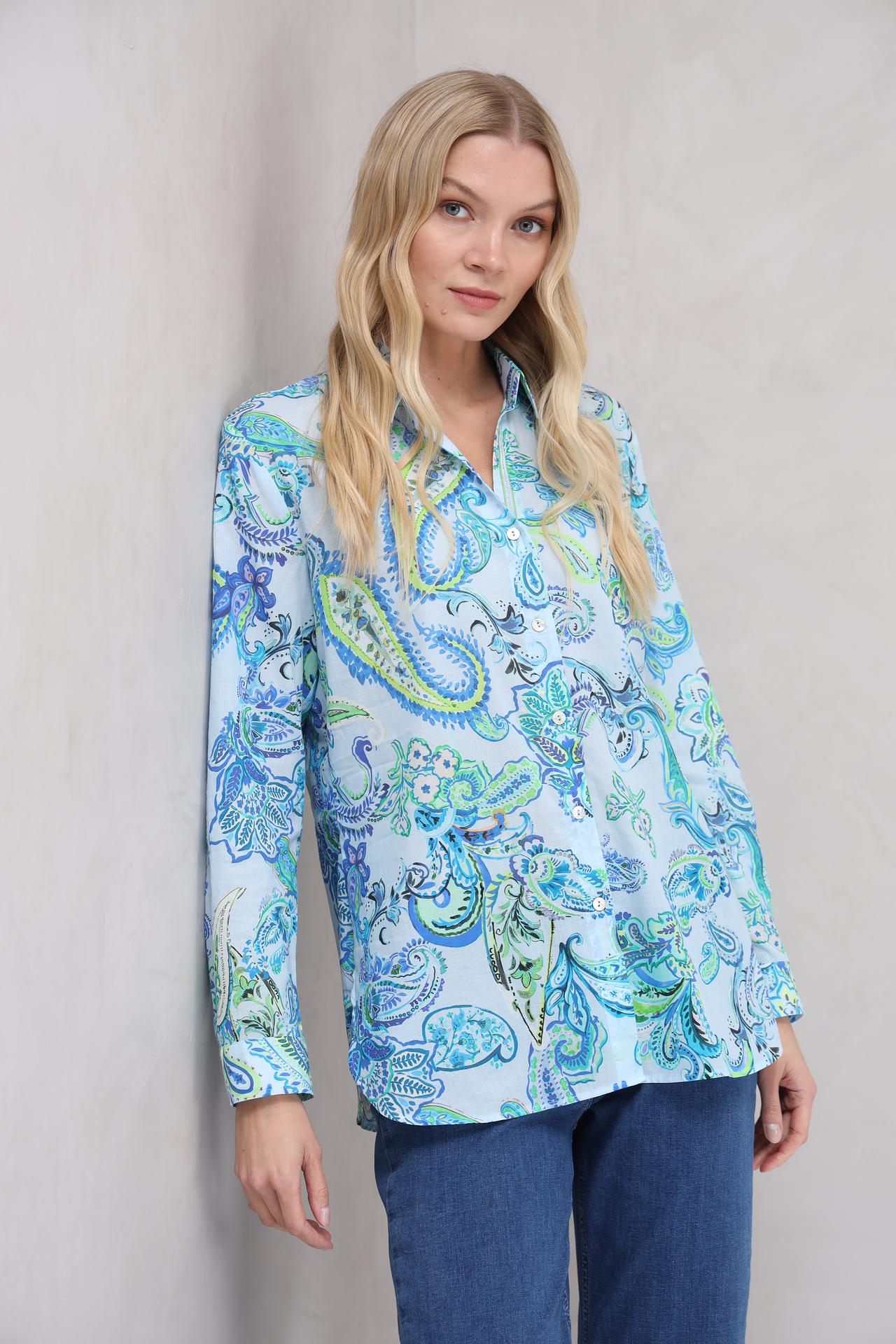 Классическая женская рубашка SE Stenau с длинным рукавом выполнена из 100% хлопка, обеспечивая исключительный комфорт и легкость. Модель украшена ярким и детализированным пейсли принтом в оттенках голубого, синего и зеленого, что придает ей свежий и запоминающийся вид. Эта стильная рубашка идеально подходит для создания как повседневных, так и более элегантных образов.