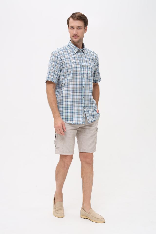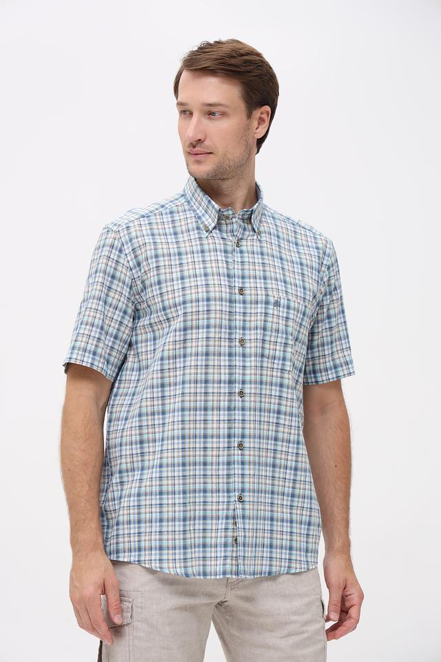 Рубашка имеет короткий рукав и классический крой, что обеспечивает комфортную посадку по фигуре. Воротник рубашки выполнен в традиционном стиле, а застежка на пуговицах обеспечивает надежность и удобство.