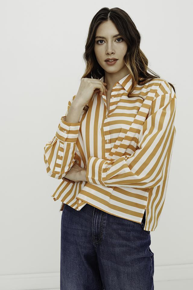 Рубашка имеет классический крой с длинными рукавами и воротником. Особенностью модели является яркий оранжевый цвет в сочетании с белыми полосками, создающими стильный и динамичный образ.