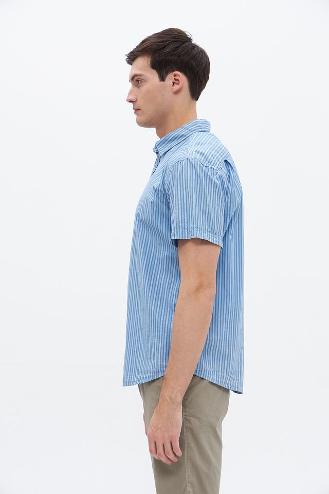Вертикальная полоска голубого цвета визуально вытягивает силуэт и придает образу свежесть. Рубашка имеет классический воротник и застежку на пуговицах. Детализированный дизайн и качественный пошив подчеркивают стиль и надежность изделия.