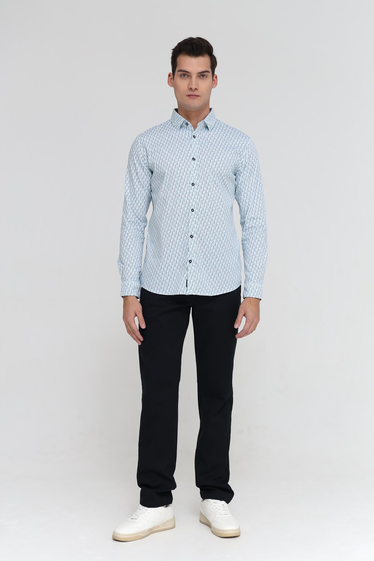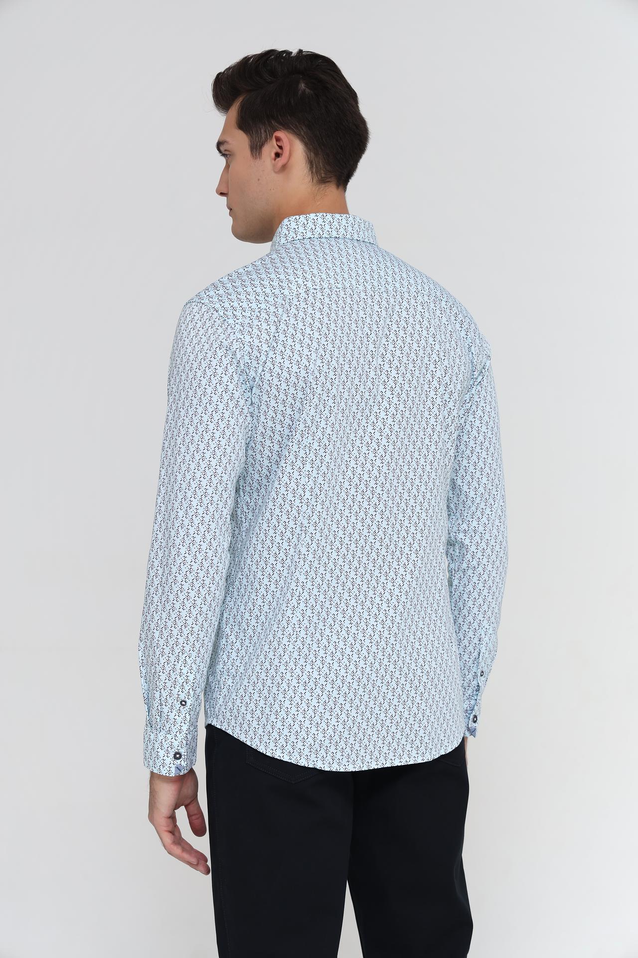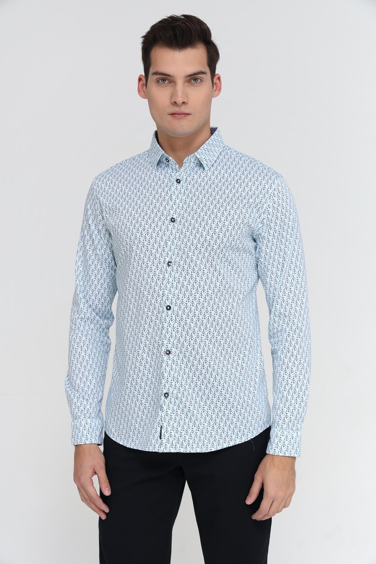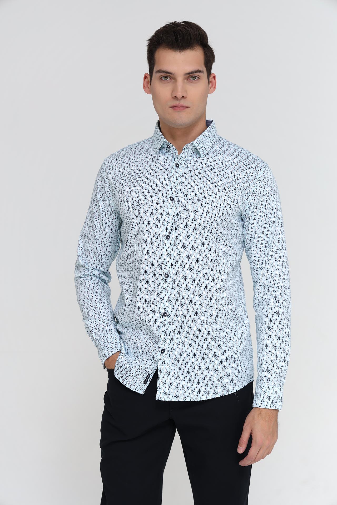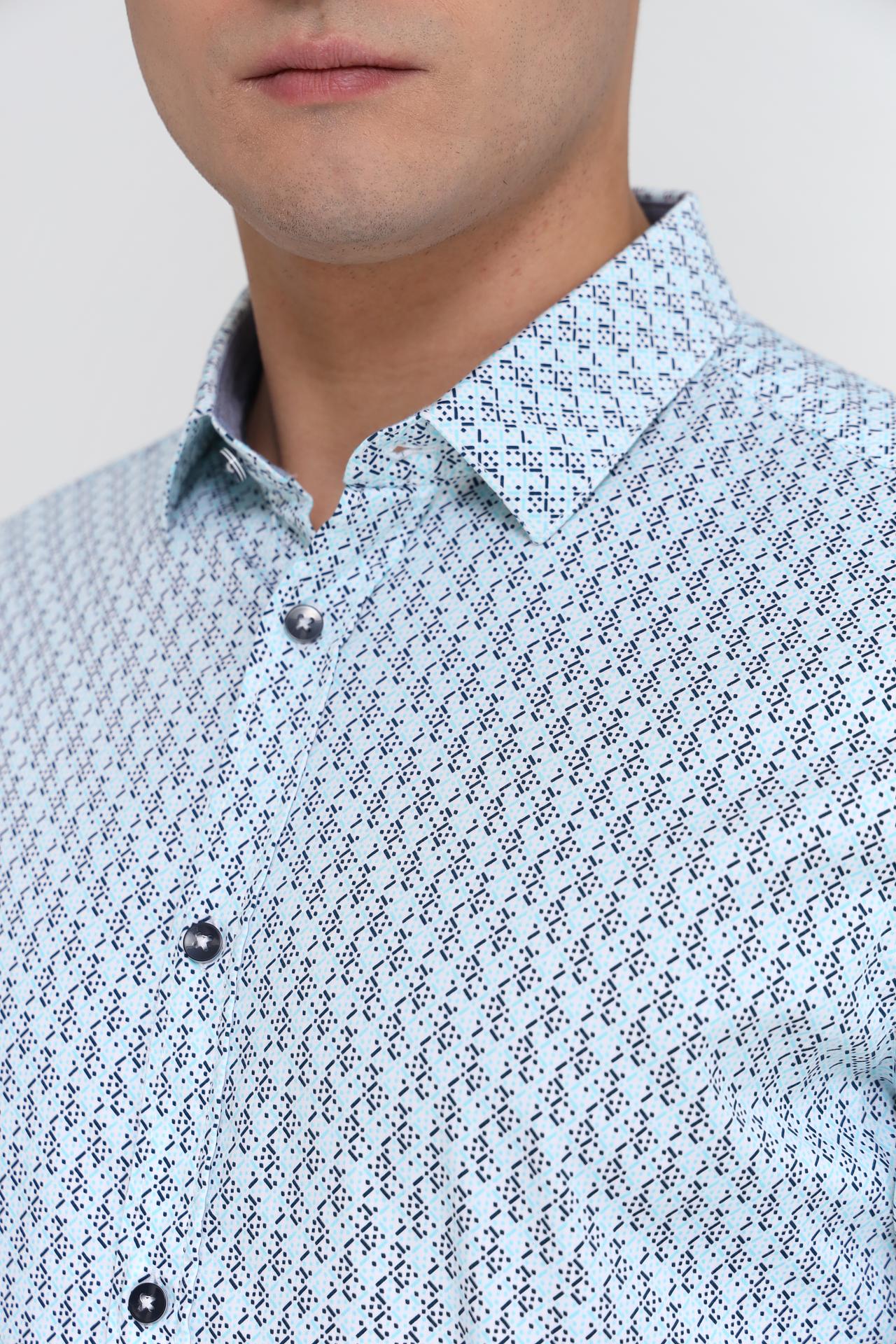 Благодаря добавлению эластана, рубашка хорошо тянется и не сковывает движения. Приталенный крой подчеркивает фигуру, а стильный мелкий рисунок добавляет оригинальности образу. Классический воротник и застежка на пуговицы придают рубашке элегантный вид.