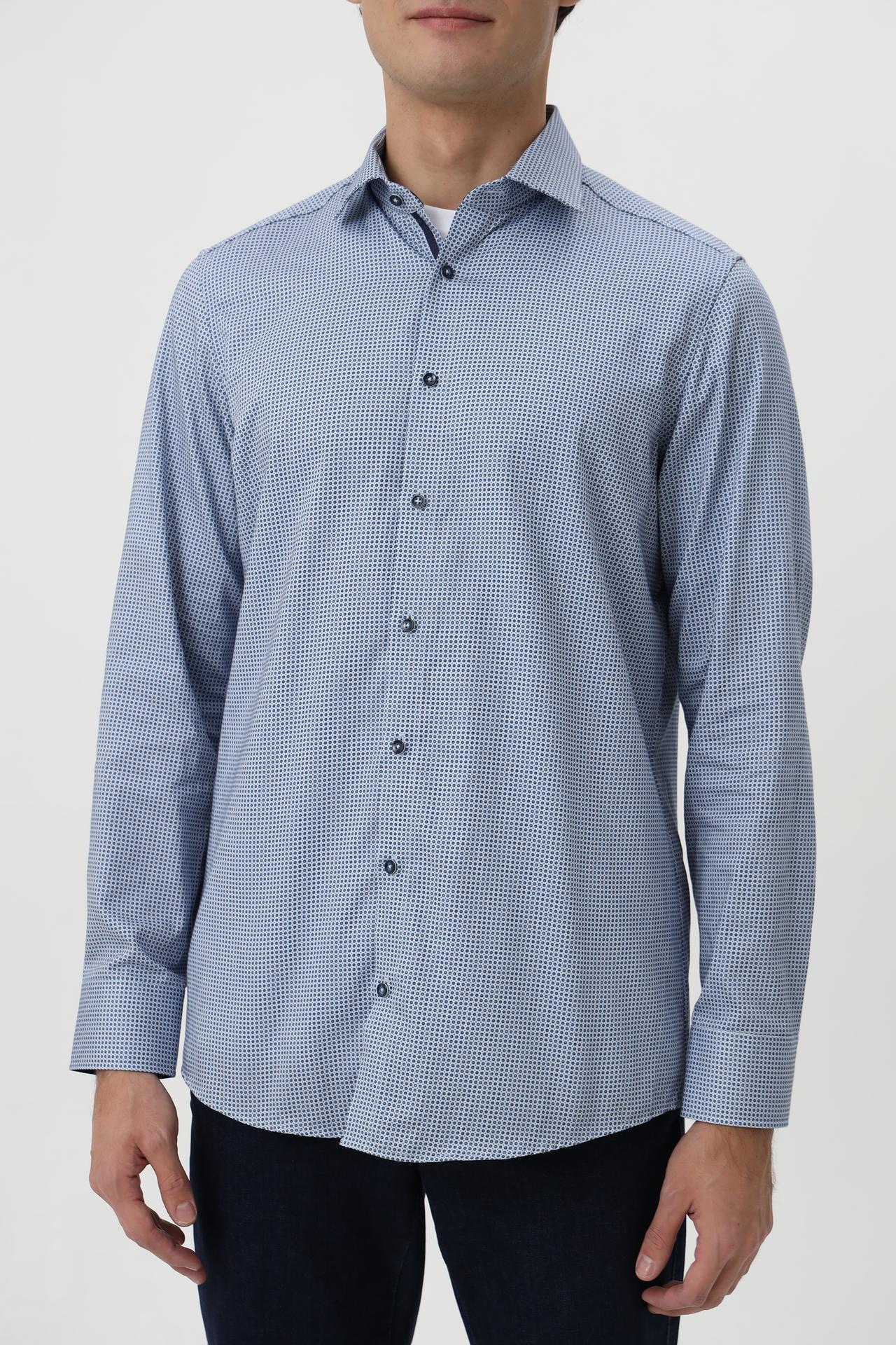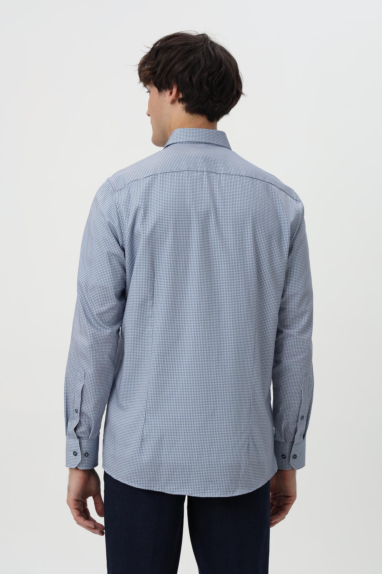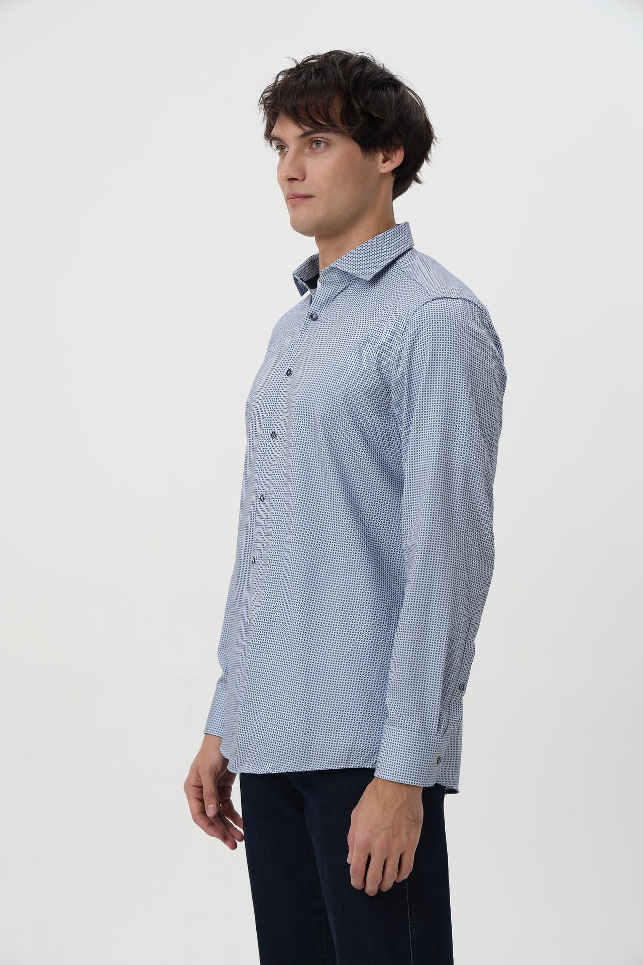 - Цвет: Изысканный синий цвет с контрастным принтом позволяет легко сочетать рубашку с различными элементами гардероба, создавая стильные и запоминающиеся образы.