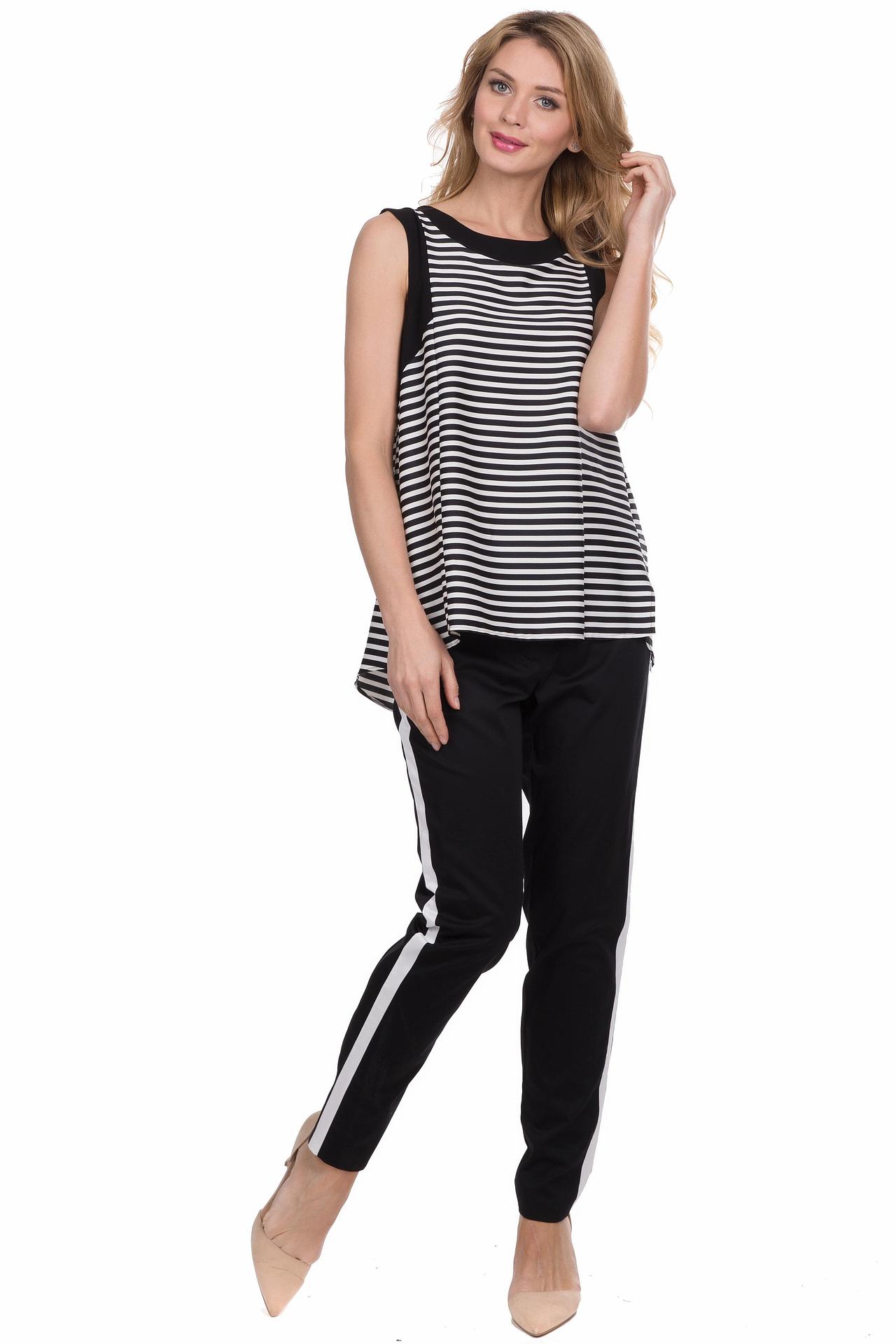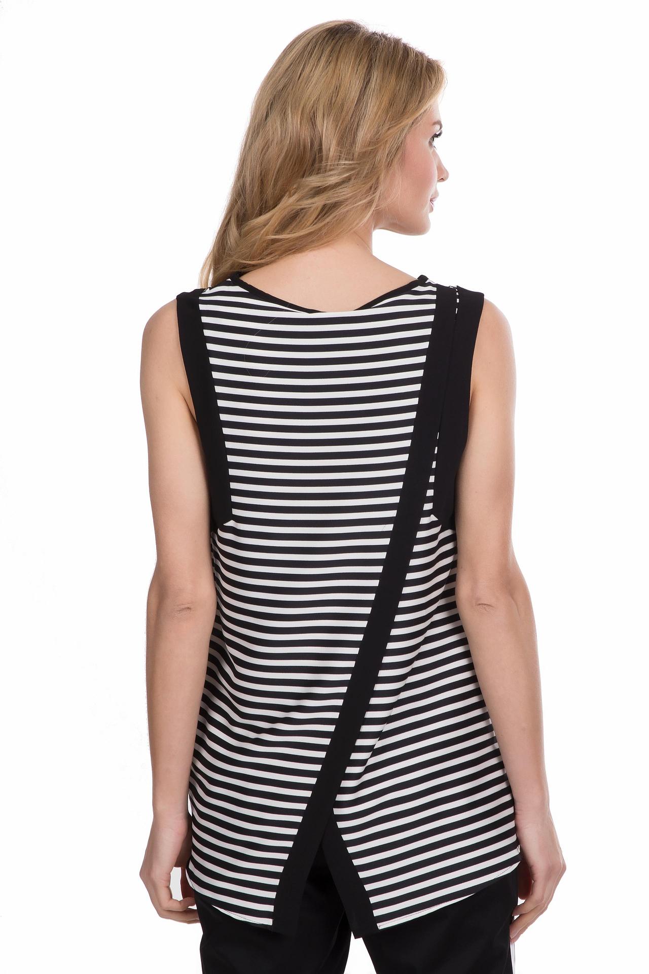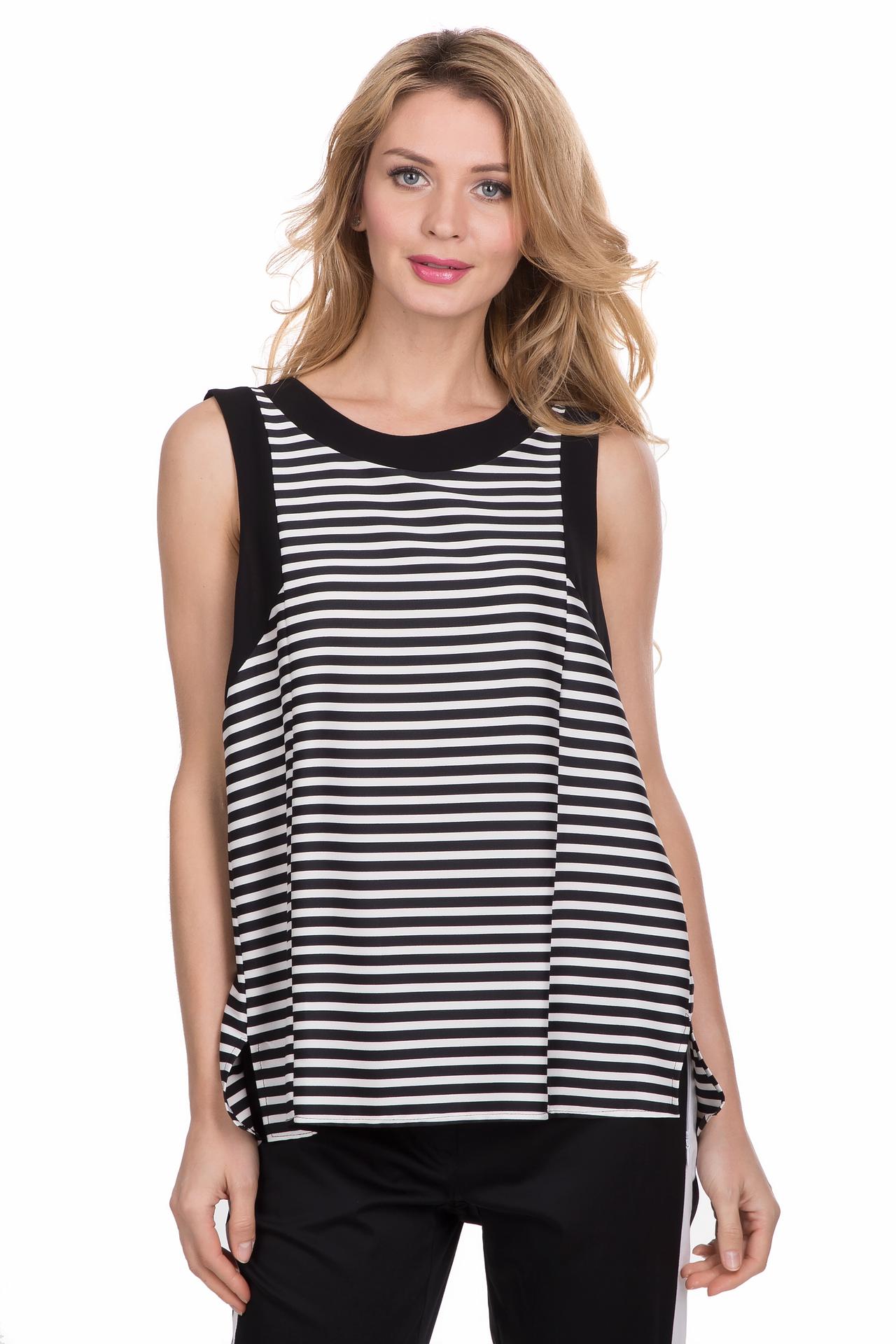 - Дизайн: Модель отличается оригинальным кроем. Черные вставки по бокам и диагональная деталь на спине придают блузе современный вид. Отсутствие рукавов и удобный круглый вырез горловины обеспечивают свободу движений.