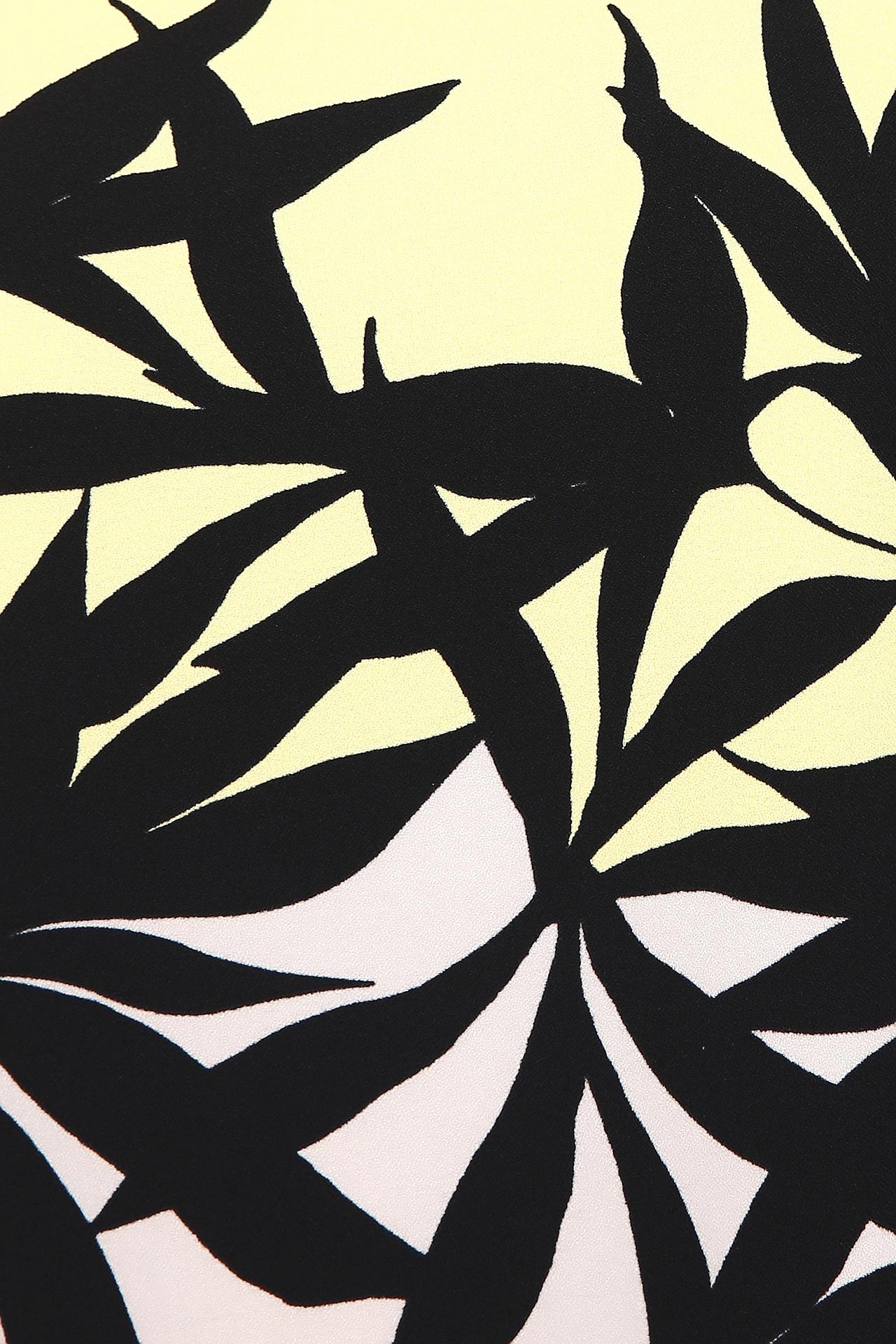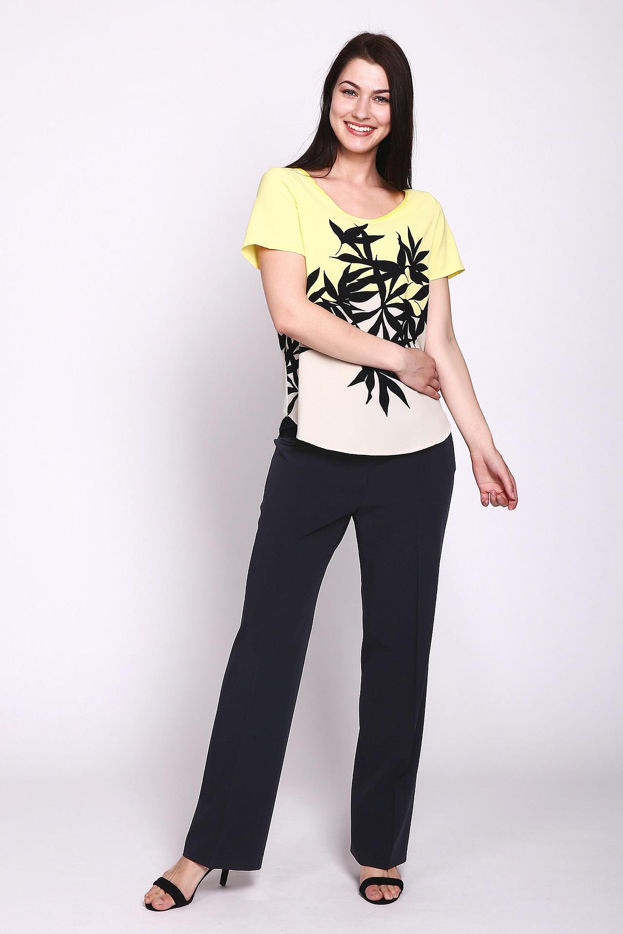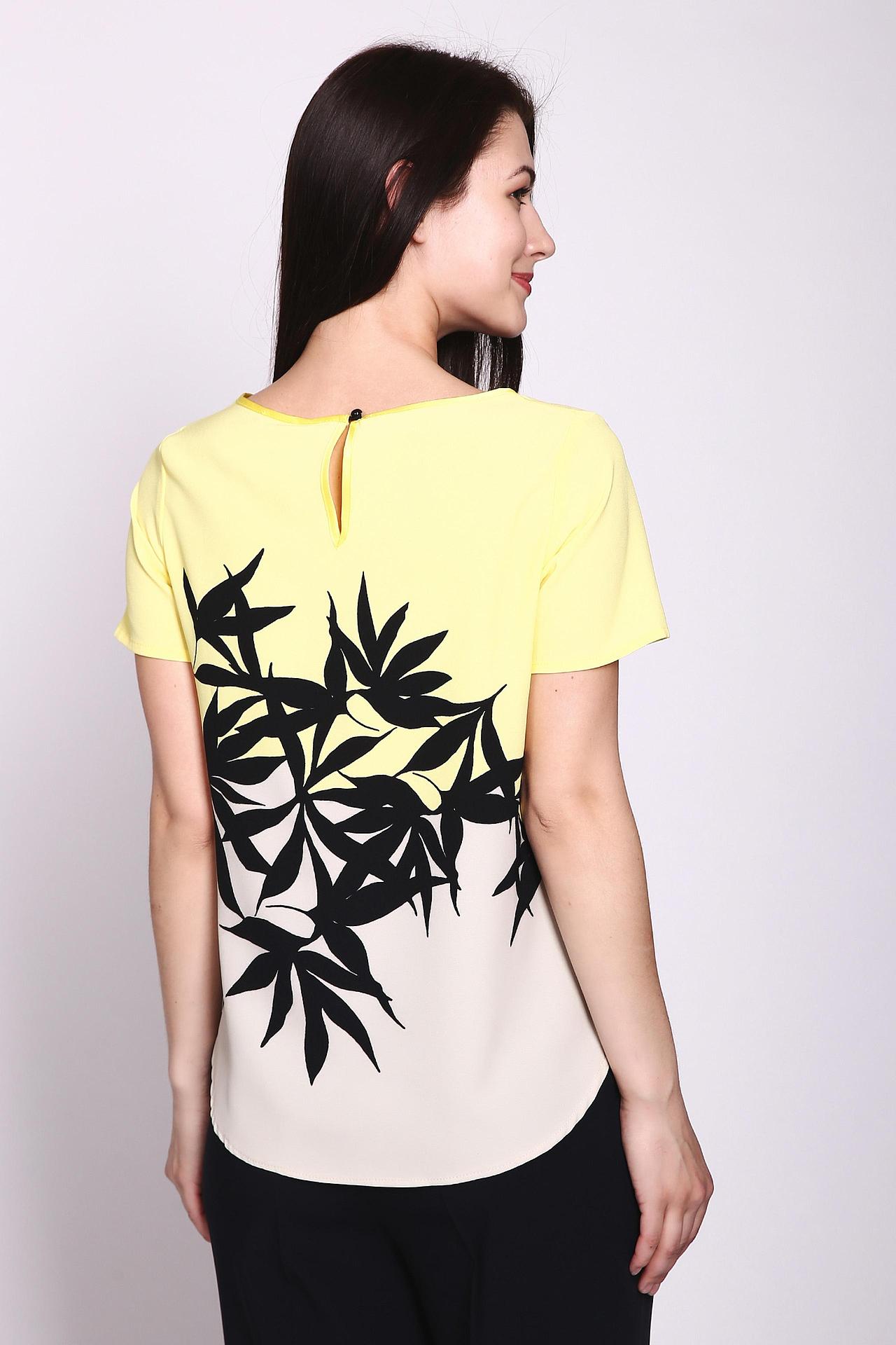 - Дизайн: Блуза украшена эффектным принтом с изображением тропических листьев, который занимает переднюю и заднюю часть изделия. Классический круглый вырез и короткие рукава делают эту модель универсальной.