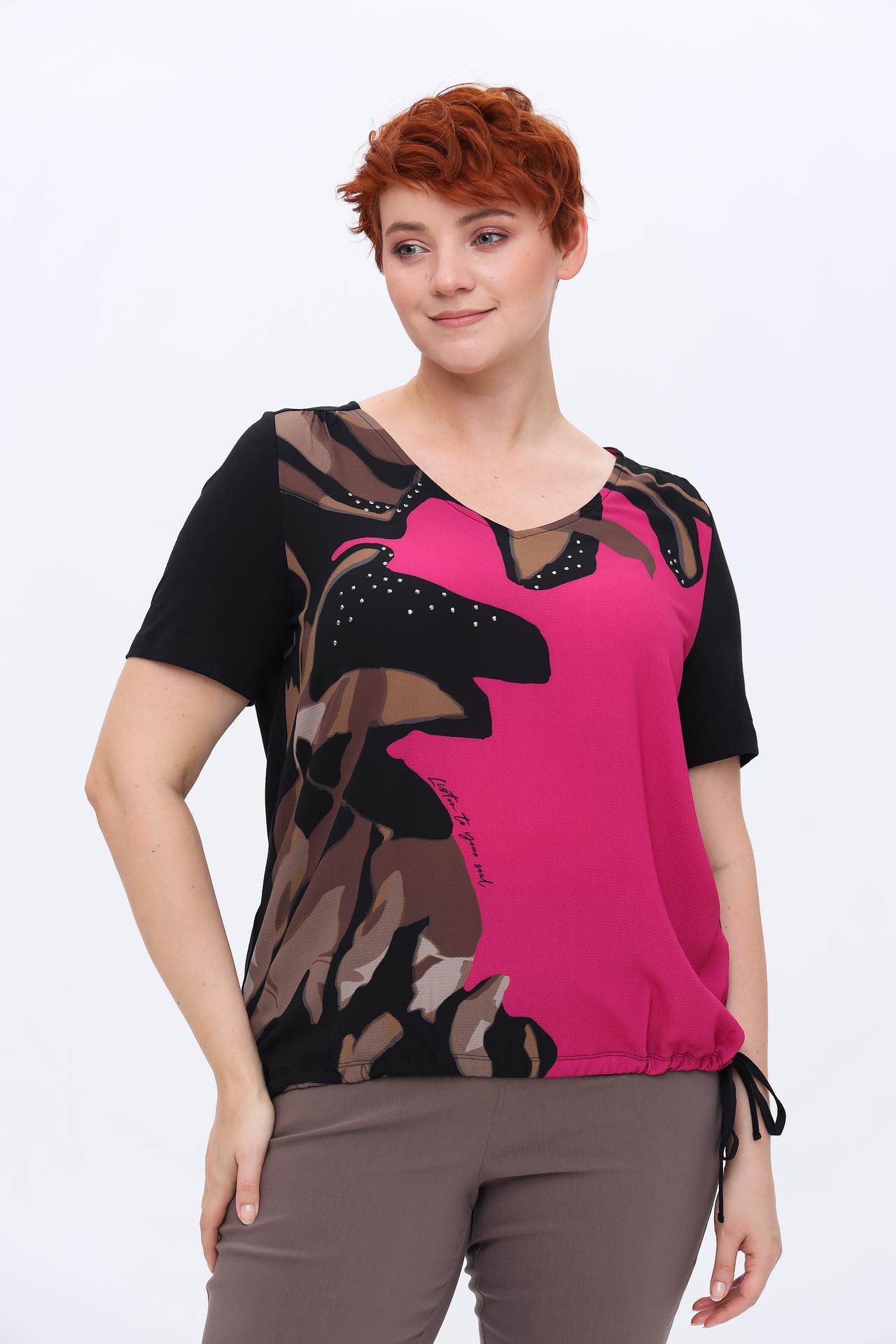 Блуза украшена ярким принтом и деликатными стразами, которые добавляют ей изысканности и шарма. V-образный вырез горловины подчеркивает линию шеи, а кулиска по низу изделия позволяет регулировать силуэт.