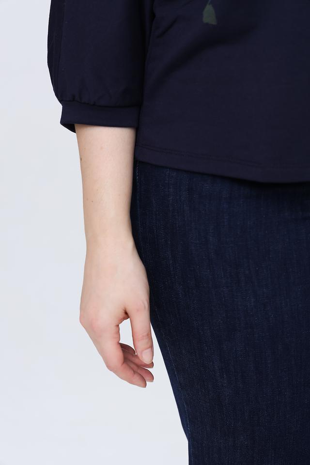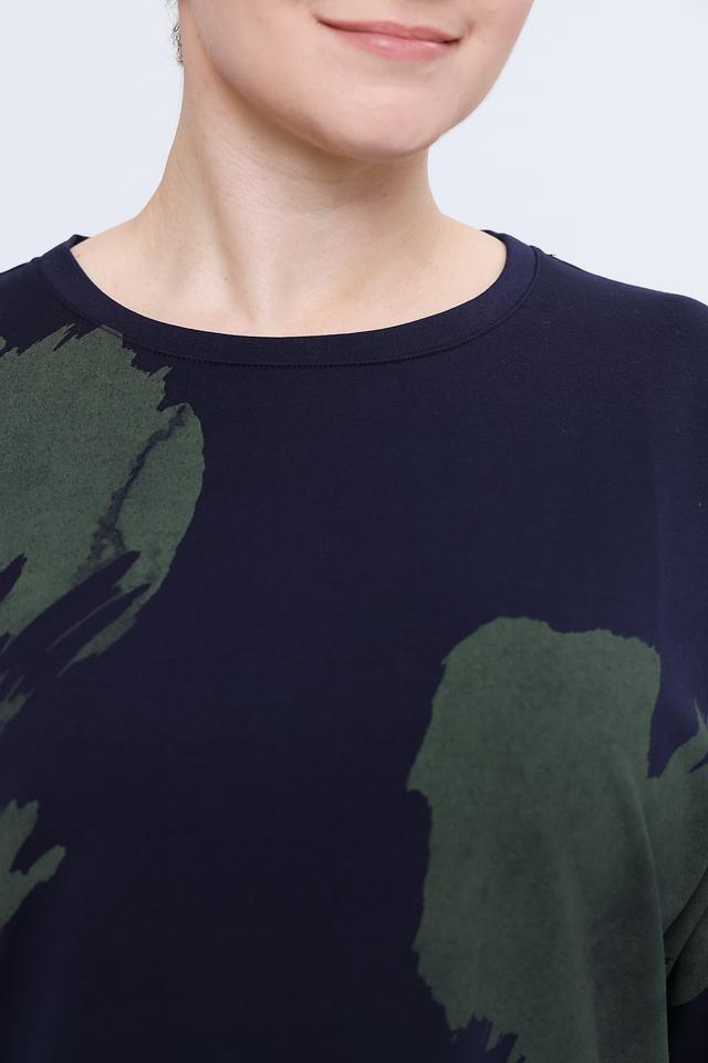 Основной цвет джемпера – тёмно-синий, который служит идеальным фоном для оригинального принта в виде мазков оливкового цвета. Этот принт добавляет изделию художественности и индивидуальности.