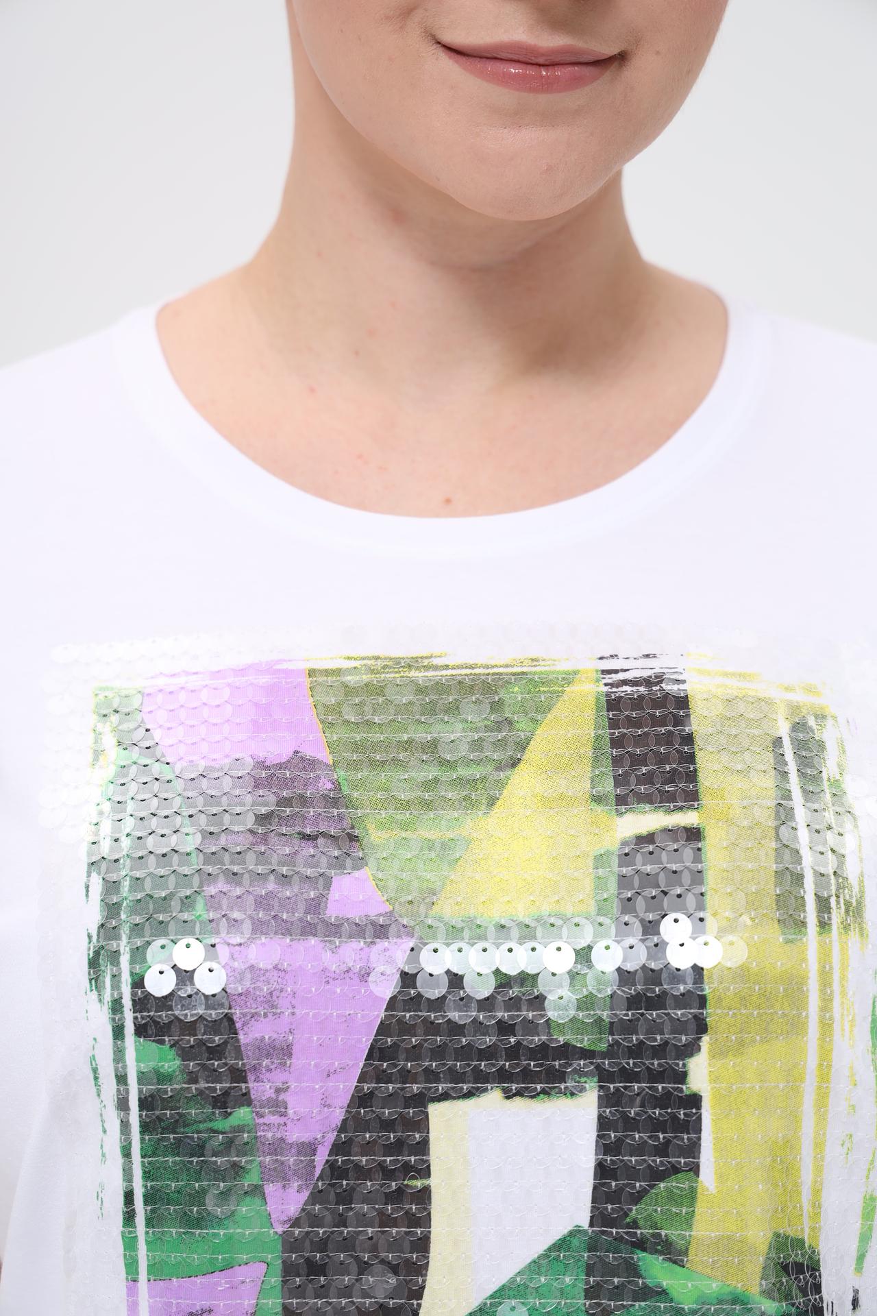 - Элегантный принт. Оригинальный принт с пайетками придаёт футболке неповторимый вид и делает её подходящей для различных случаев.