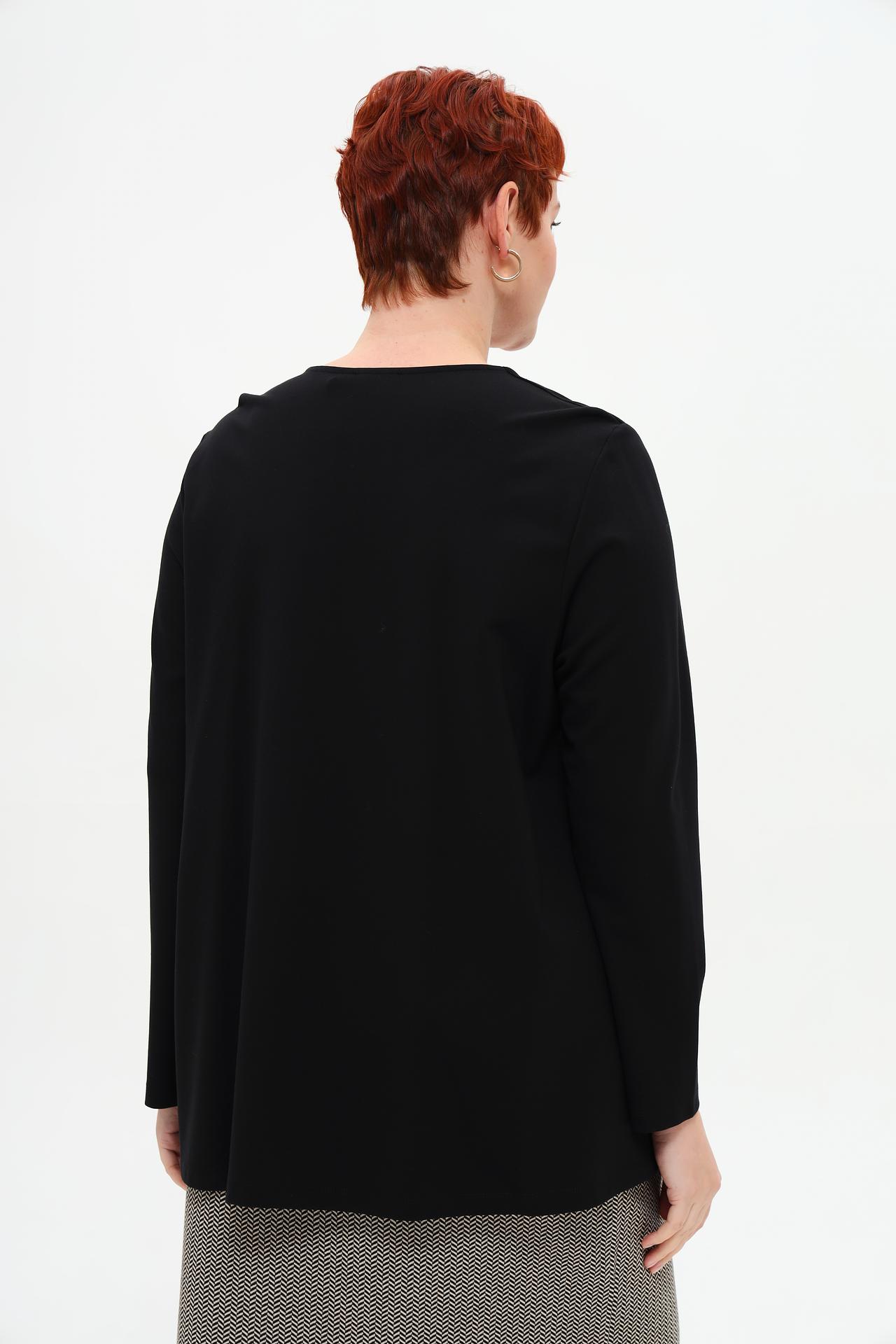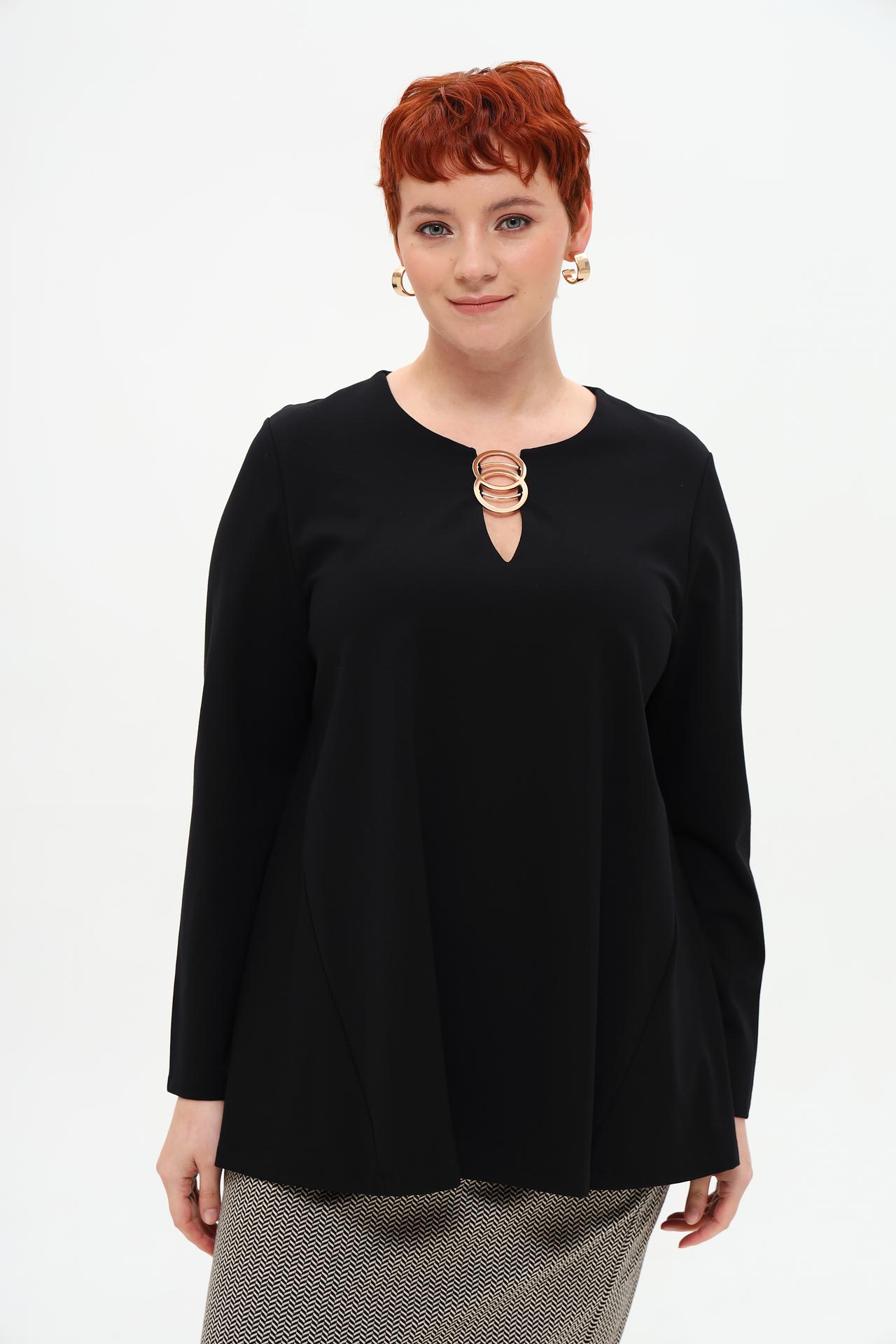 - Дизайн: Классический чёрный цвет и минималистичный крой делают эту блузу идеальным выбором для различных случаев. Декоративный элемент на вырезе горловины добавляет изюминку.