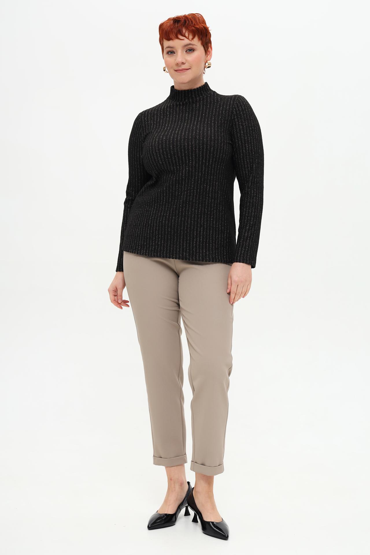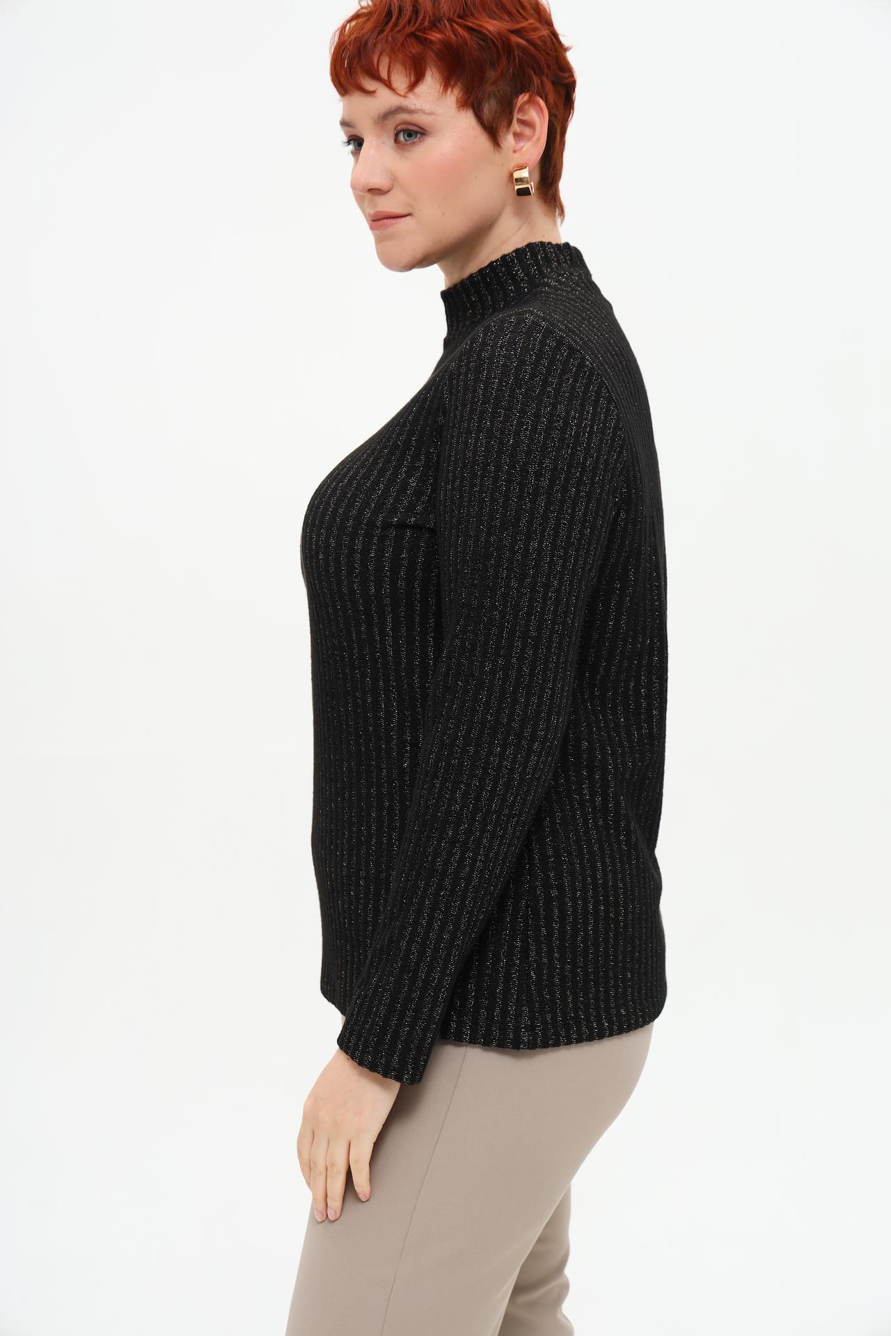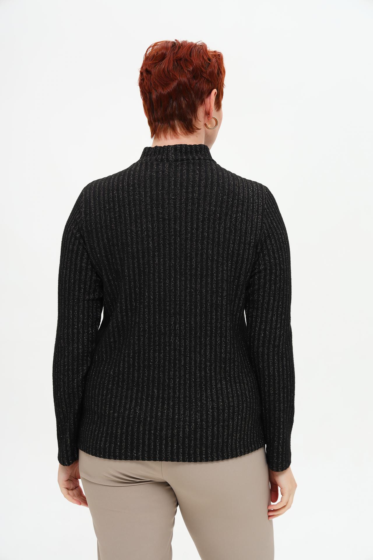 Элегантный пуловер от Samoon — идеальное дополнение к вашему повседневному и праздничному гардеробу. Модель выполнена в классическом черном цвете с вертикальными серебристыми полосами, которые создают эффект мерцания и добавляют изысканности.