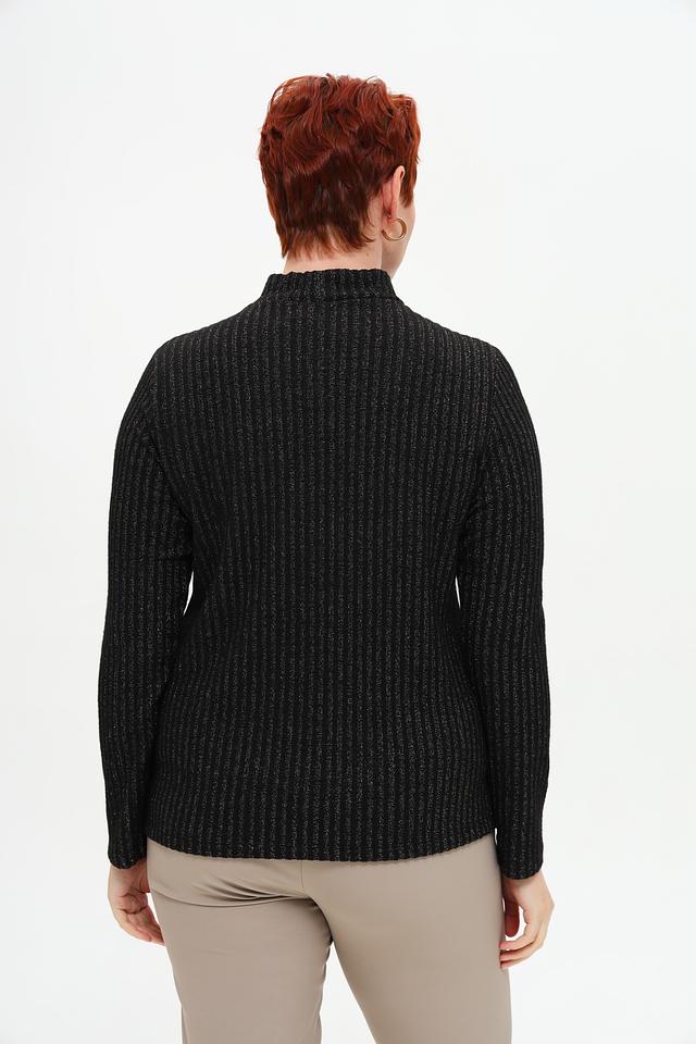 Женский пуловер Samoon чёрного цвета с вертикальными полосками и добавлением металлизированной нити. Изготовлен из мягкого и приятного к телу сочетания полиэстера, вискозы и эластана. Состав: полиэстер 55%, вискоза 25%, метализ.нить 15%, эластан 5%