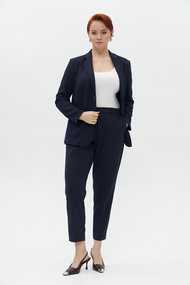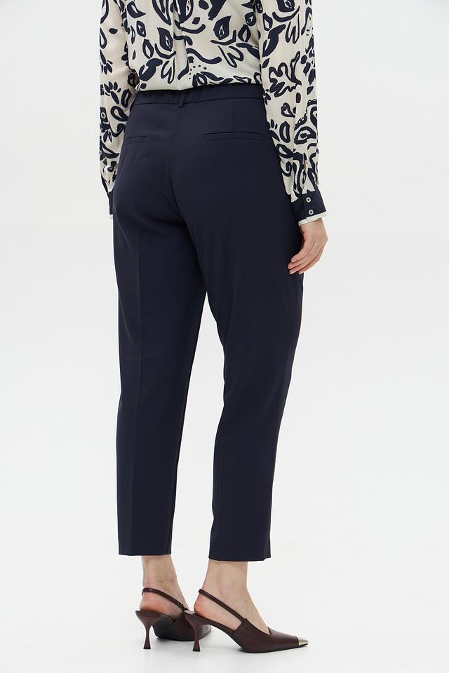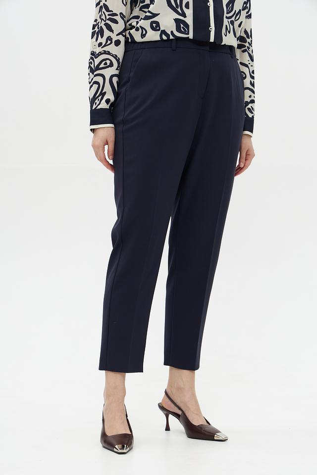 Брюки имеют прямой крой и стандартную посадку по талии. Застежка на молнию и пуговицу обеспечивает надежную фиксацию. Ткань, состоящая из полиэстера, вискозы и эластана, приятна к телу, хорошо держит форму и практически не мнется.