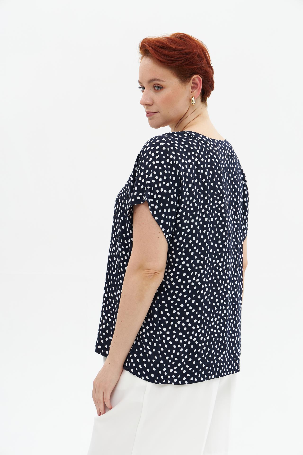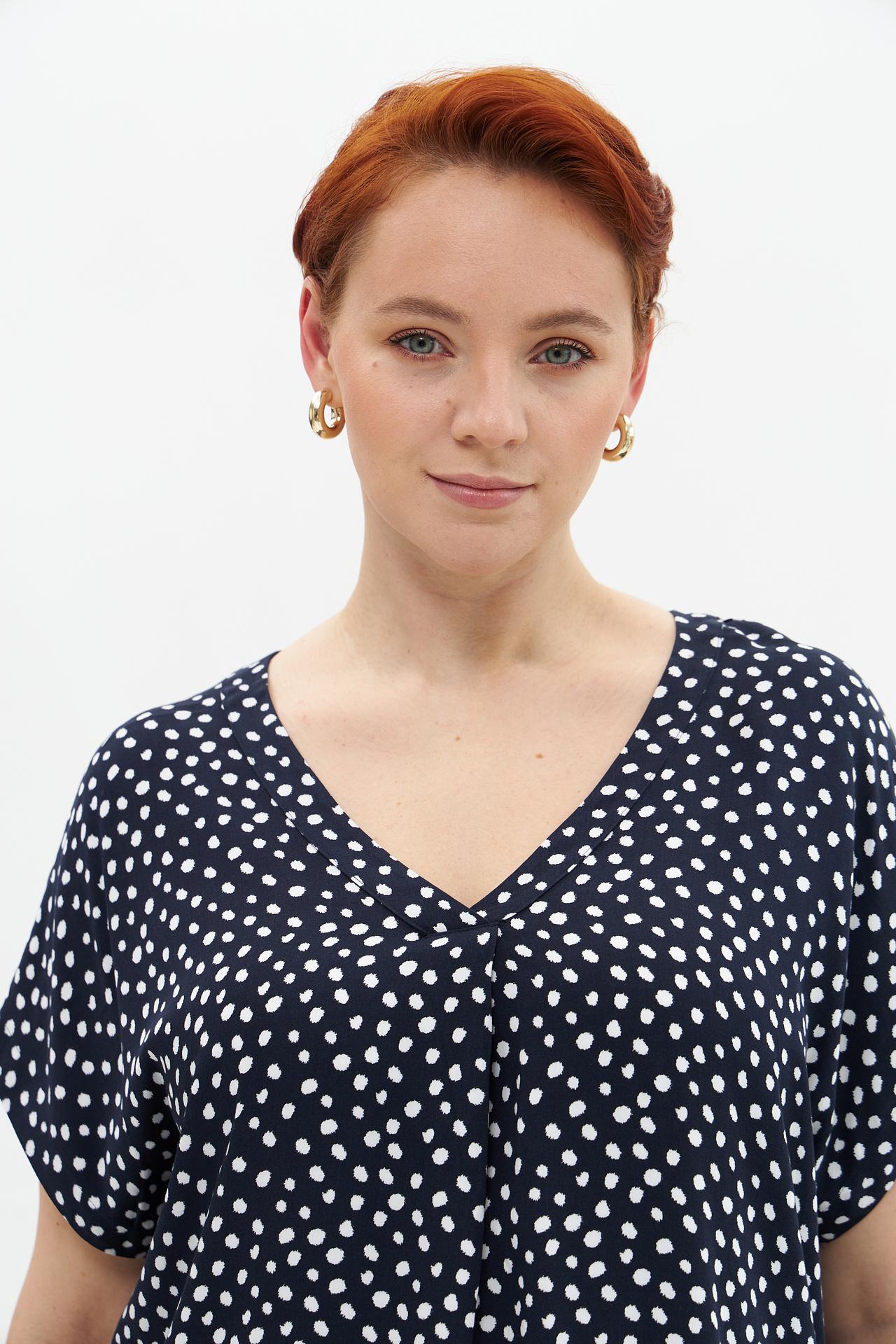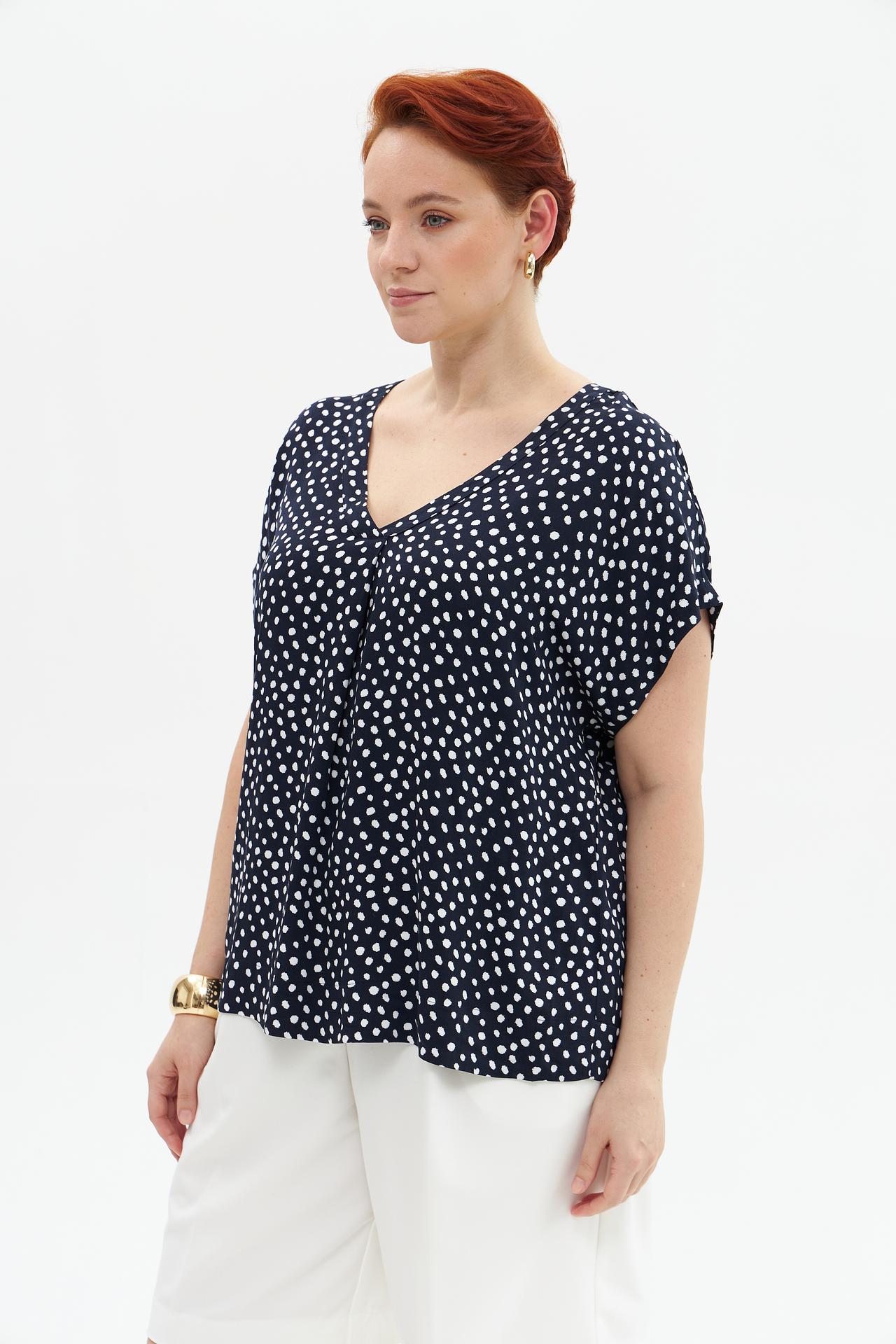 - Универсальный Дизайн: Классический синий цвет с белым горошком делает блузку универсальной для создания как повседневных, так и более формальных образов, легко сочетаясь с различными элементами гардероба.
