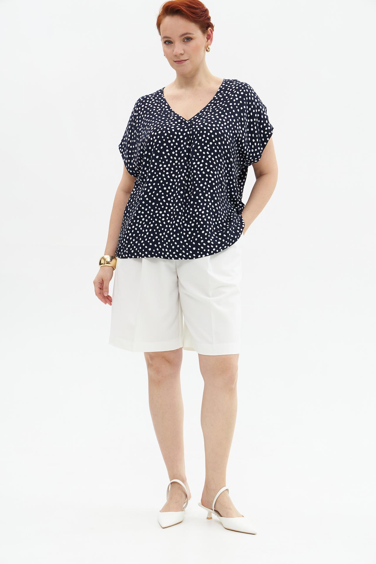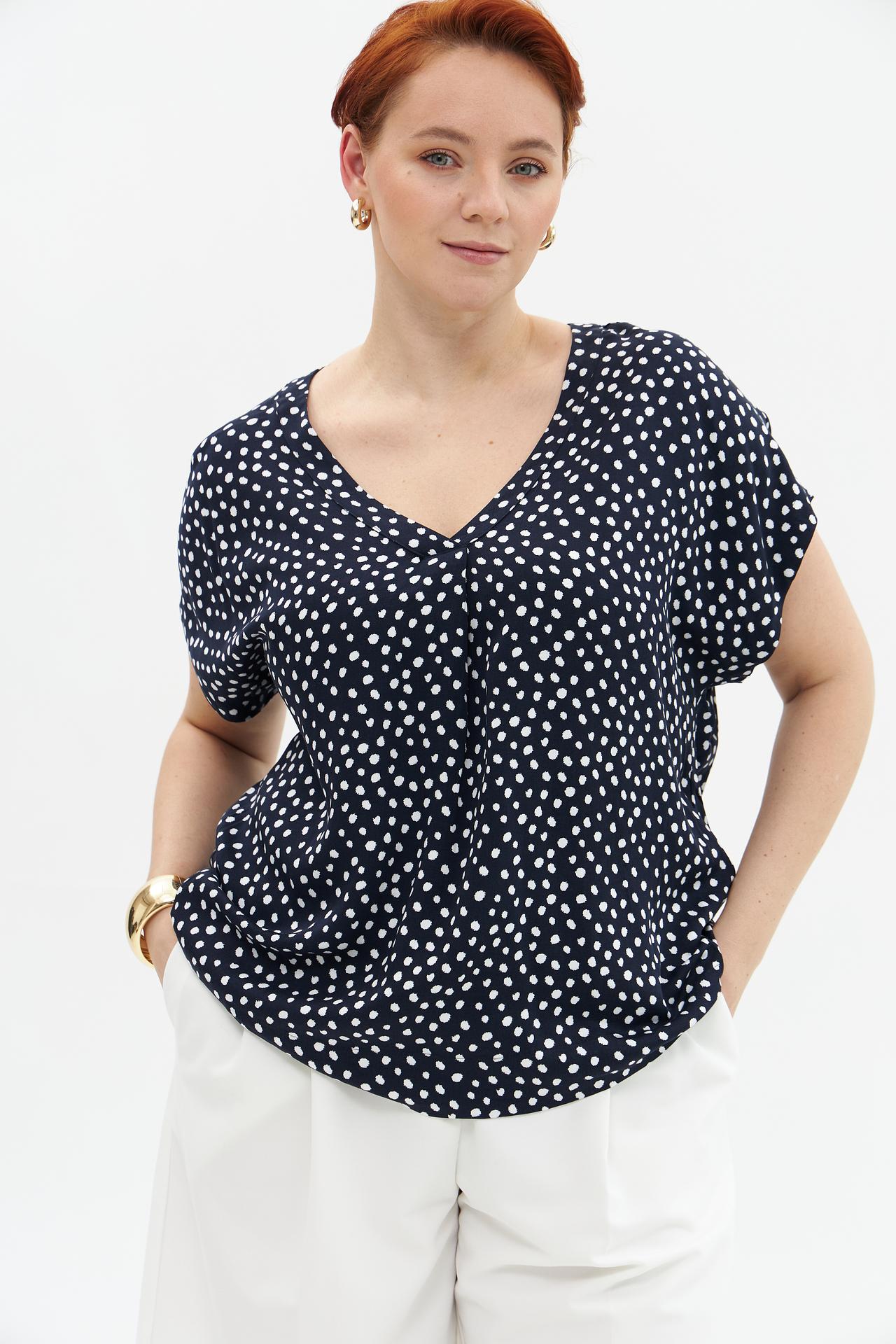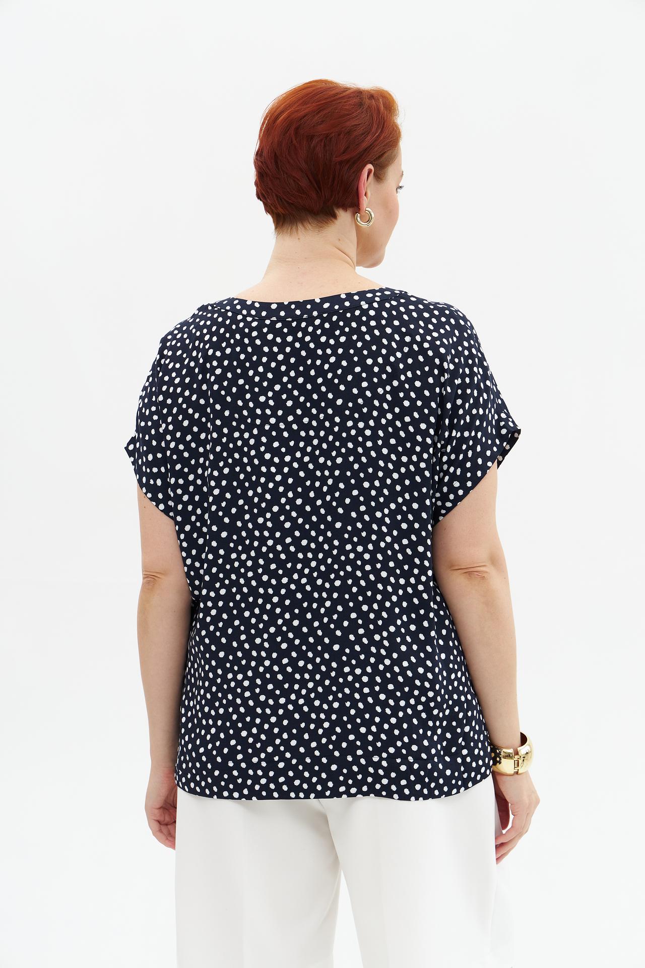 - Универсальный Дизайн: Классический синий цвет с белым горошком делает блузку универсальной для создания как повседневных, так и более формальных образов, легко сочетаясь с различными элементами гардероба.