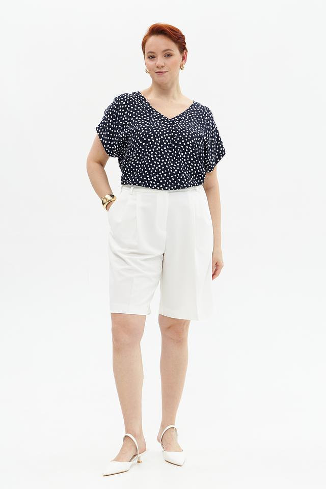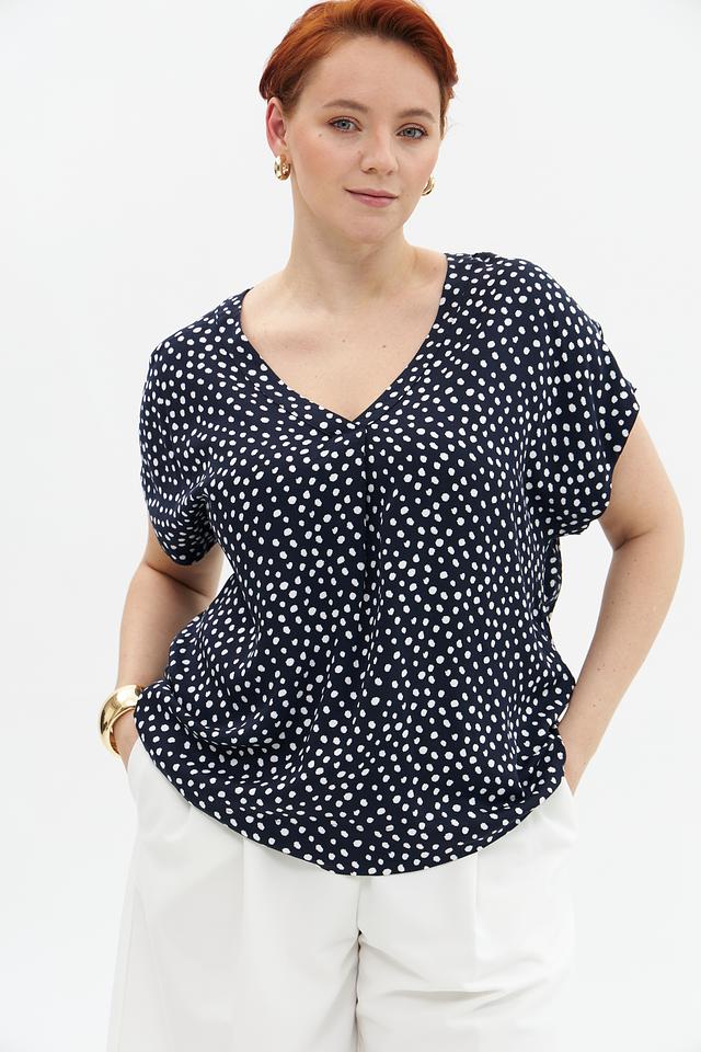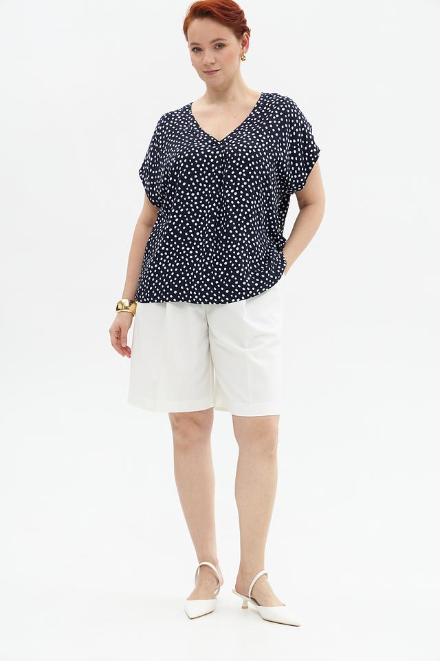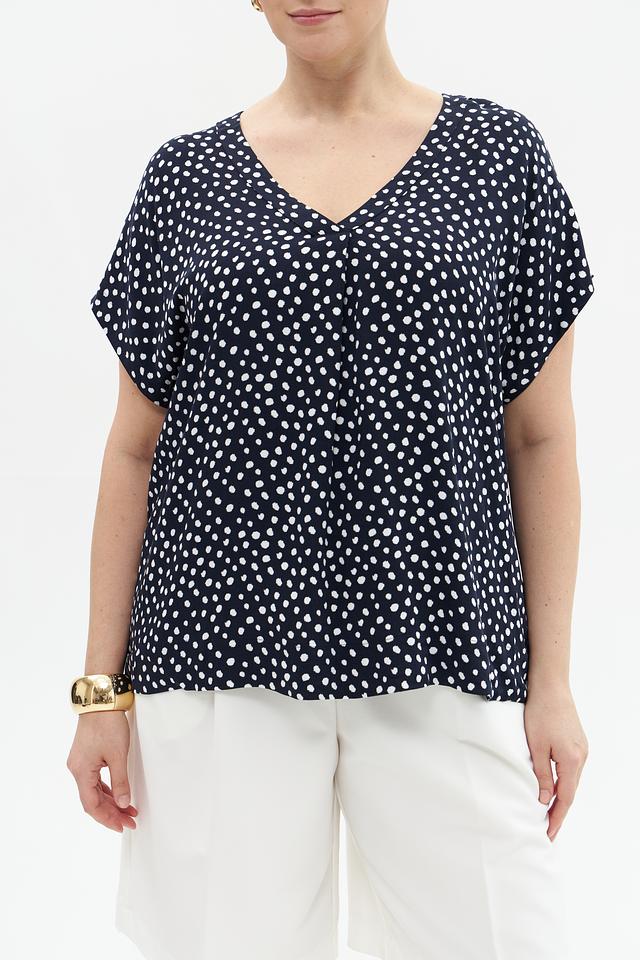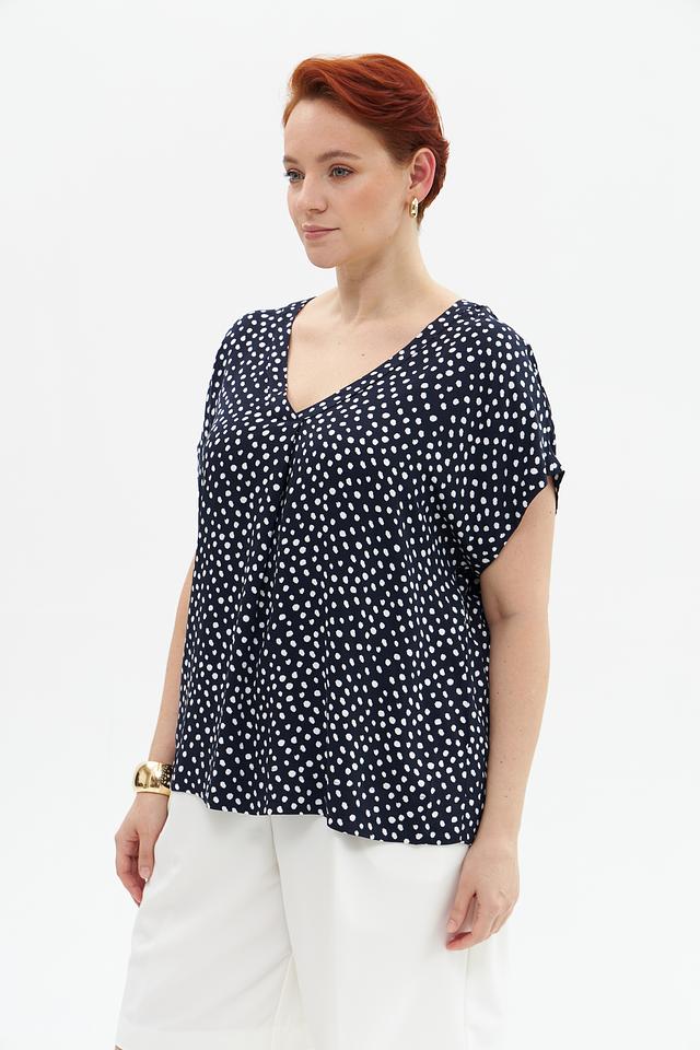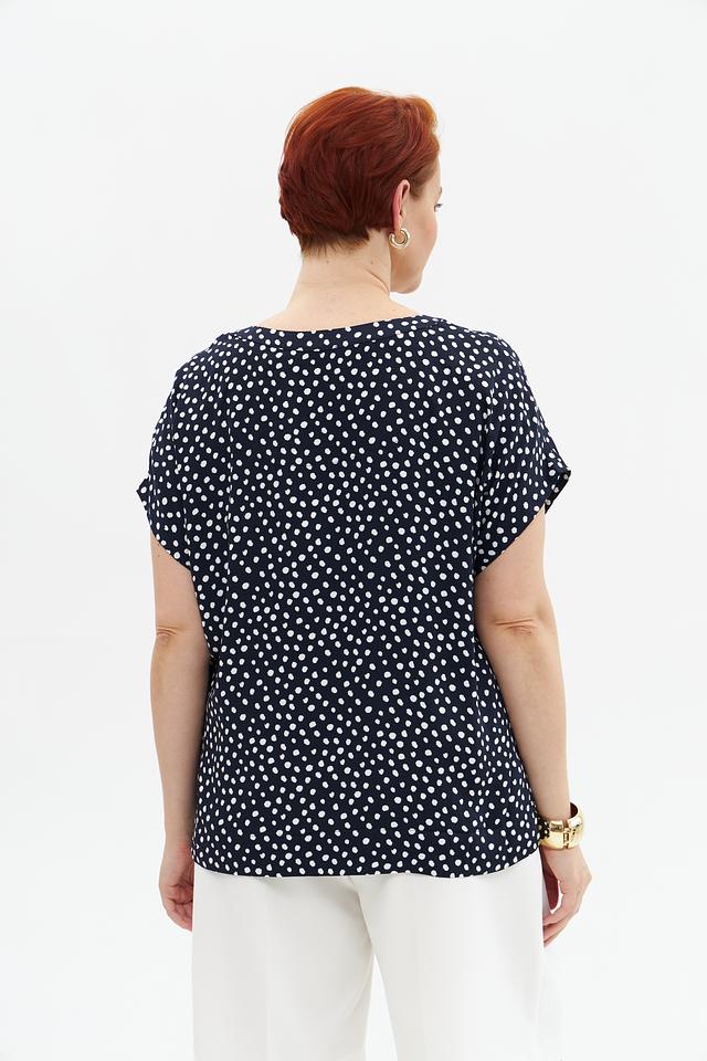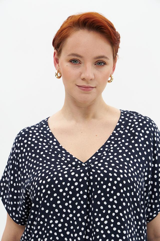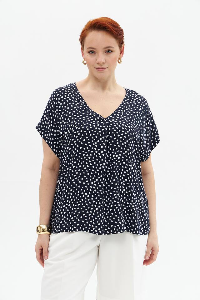 Блузка имеет классический V-образный вырез, который визуально удлиняет шею и подчеркивает линию декольте. Короткие рукава делают ее подходящей для теплой погоды. Декоративный элемент – мелкий белый горошек на темно-синем фоне, придающий модели игривость и очарование.