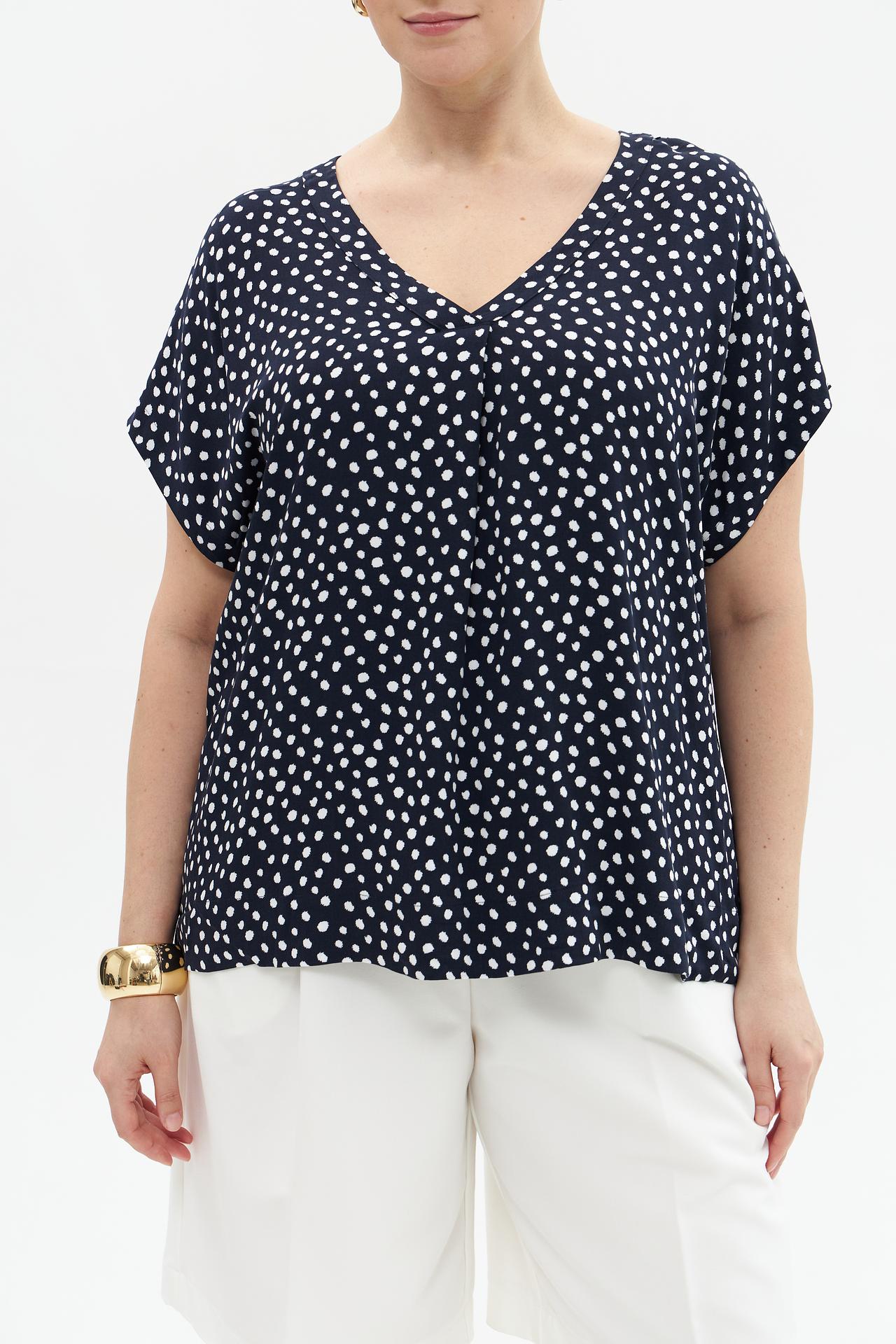 Легкая и стильная блуза Samoon выполнена из 100% вискозы, обеспечивающей исключительный комфорт и легкость. Свободный крой и элегантный V-образный вырез делают эту женскую блузу идеальным выбором для любого типа фигуры. Принт в мелкий белый горошек на глубоком синем фоне придает изделию классический и универсальный вид, идеально подходящий как для повседневного, так и для офисного образа.