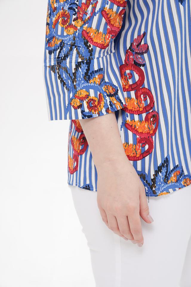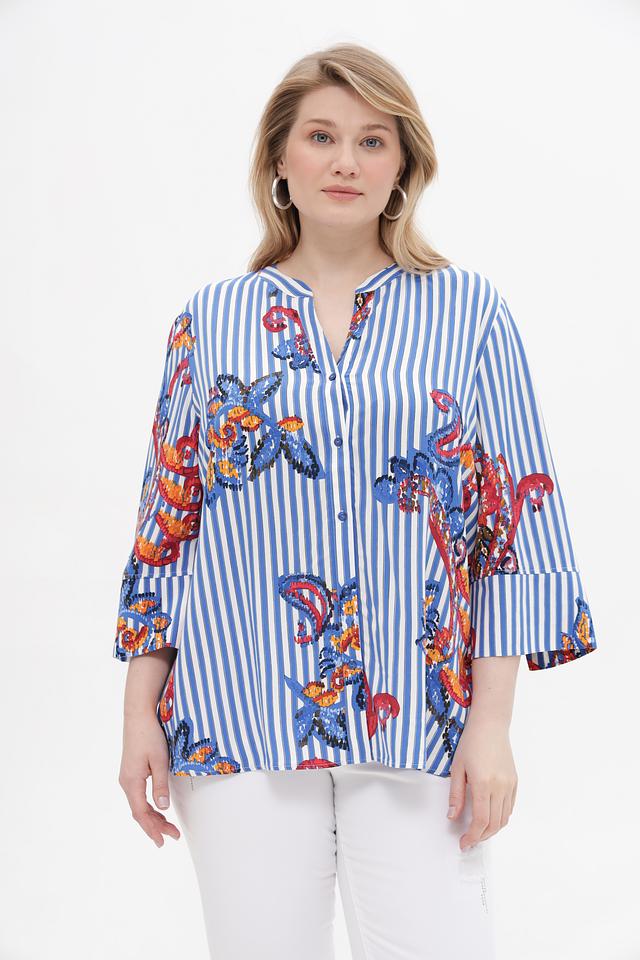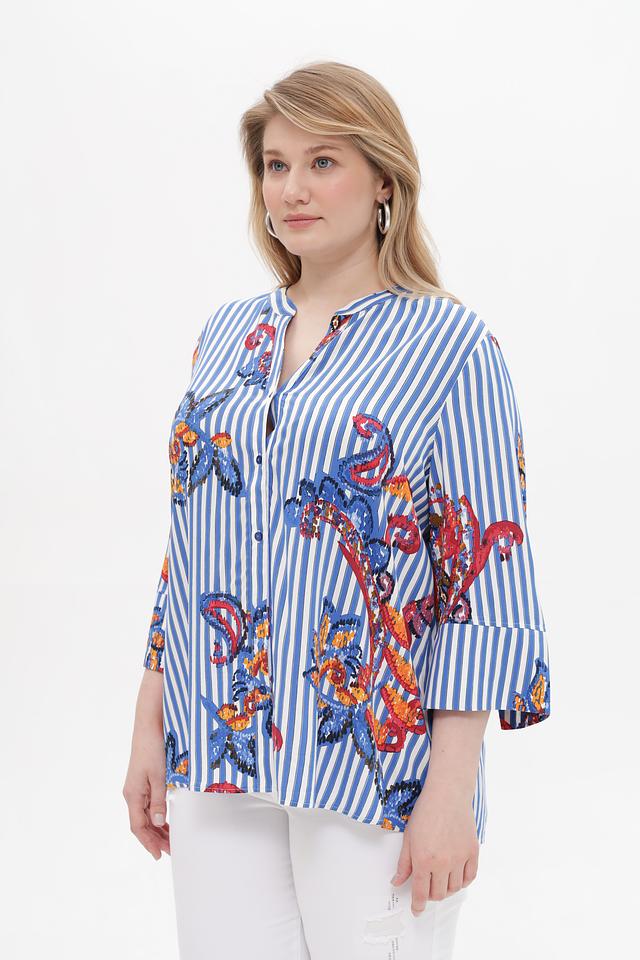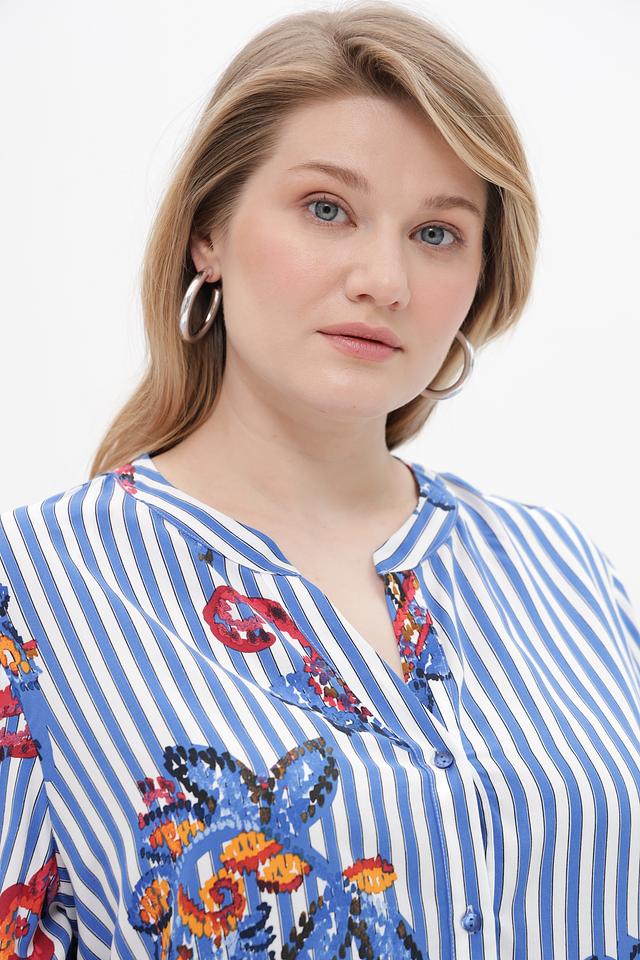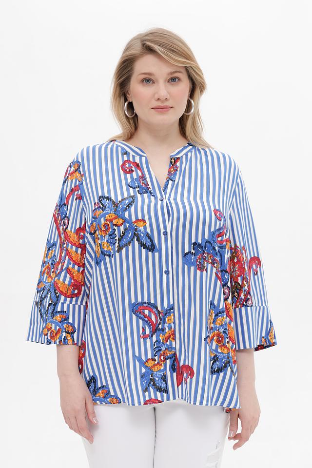 Особенностью данной блузы является яркий цветочный принт на фоне голубой полоски. Такое сочетание цветов и узоров делает блузу оригинальной и привлекательной. Рукава 3/4 делают ее универсальной для любого времени года.