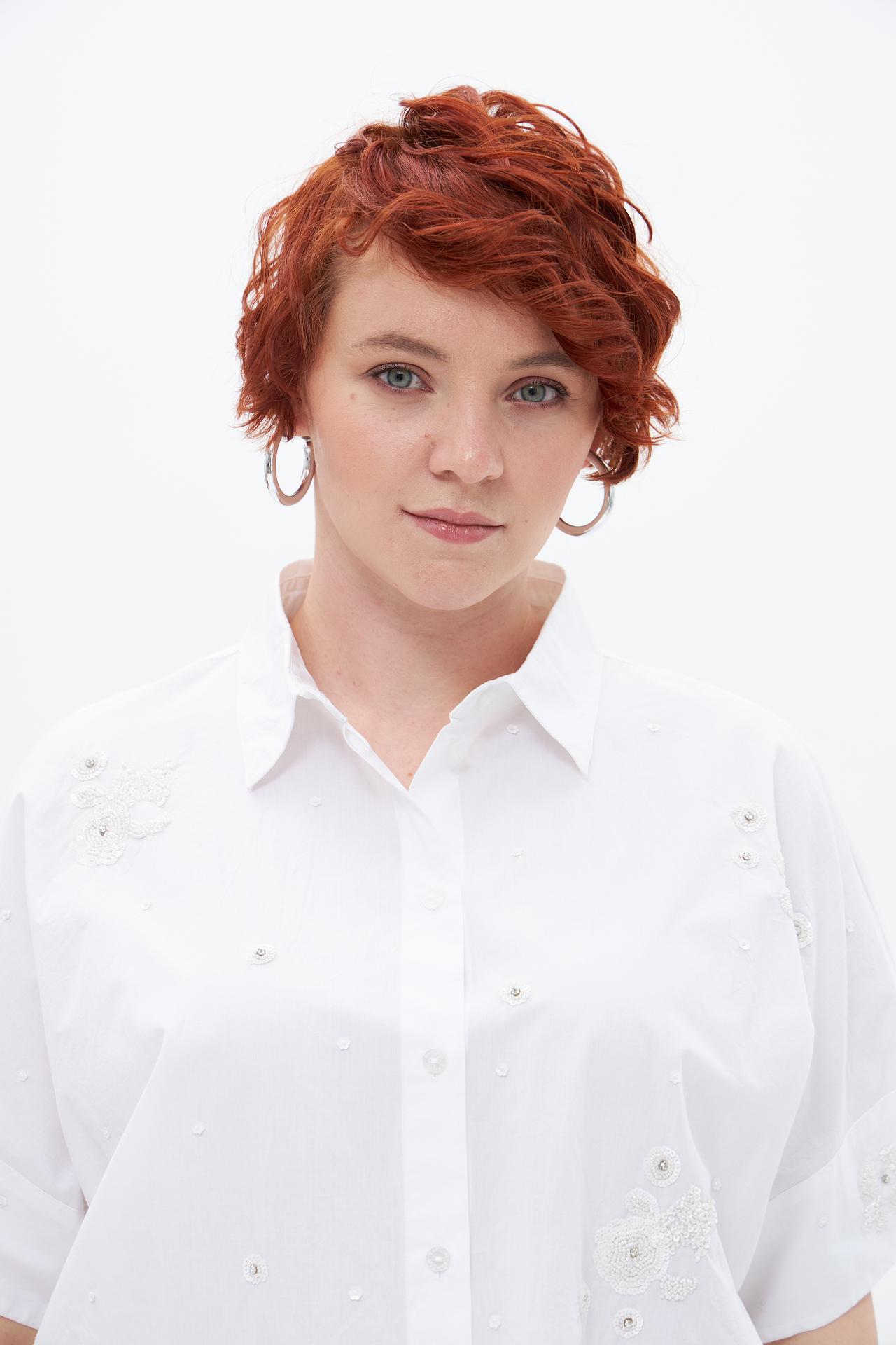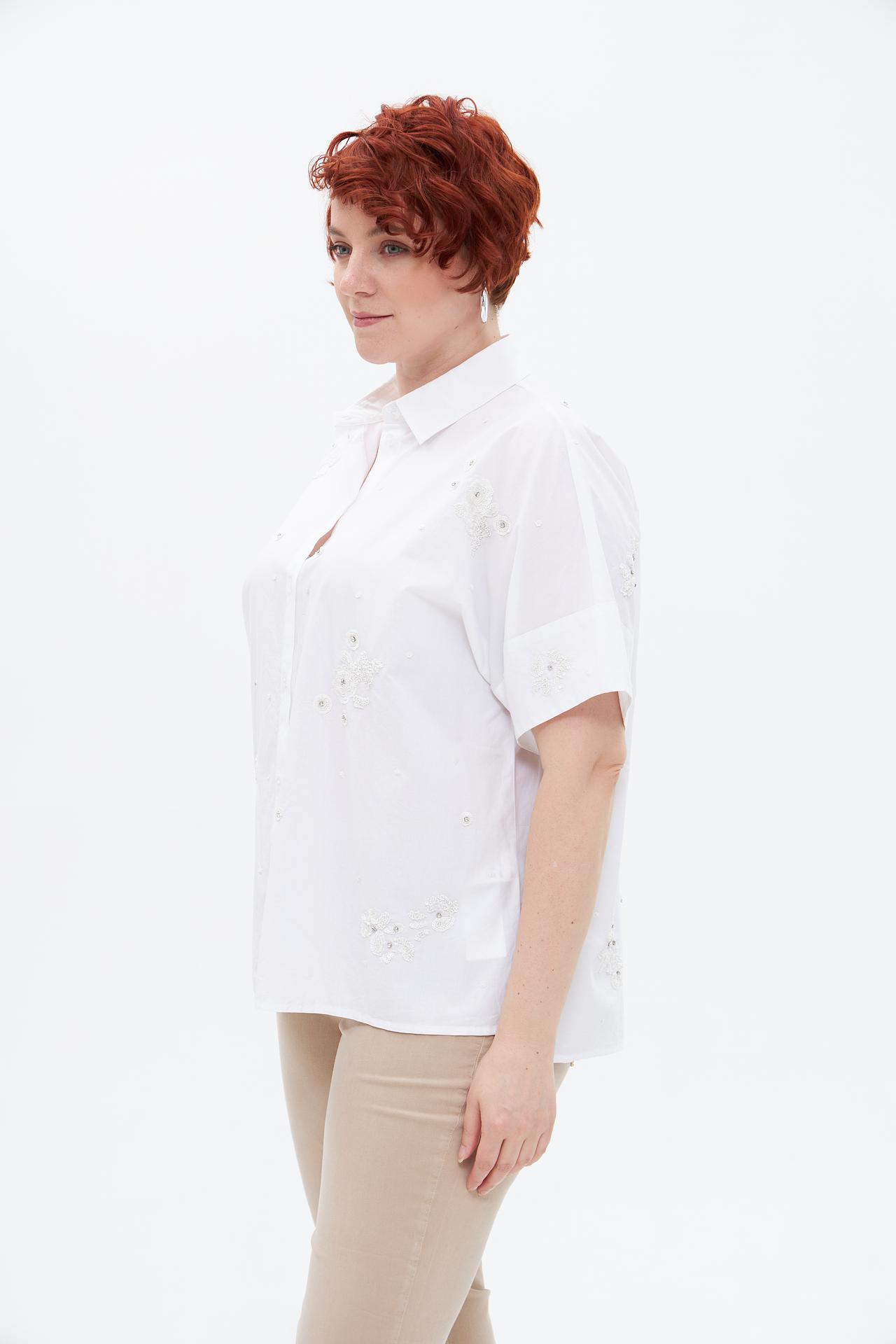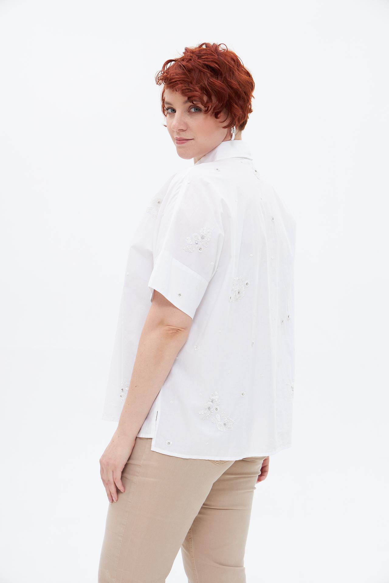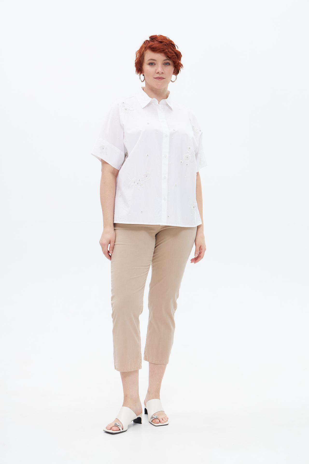 - Изысканный декор. Поверхность блузы украшена тонкой цветочной вышивкой и мерцающими мелкими пайетками или бисером, которые придают модели особую нежность и шарм. Эти акценты добавляют изящества, не перегружая образ.