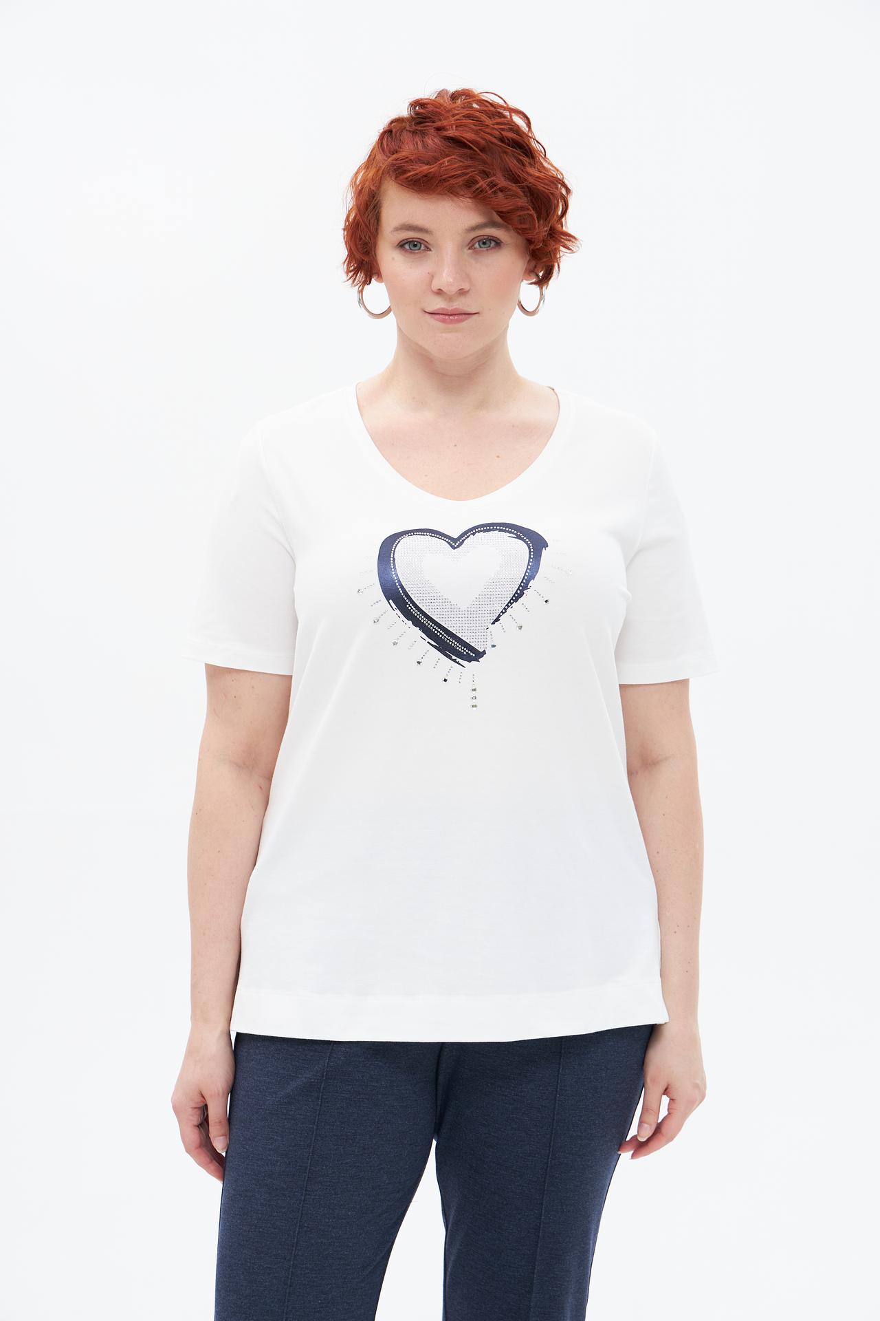 Прямой крой и классический V-образный вырез делают эту модель универсальной для любого типа фигуры. Центральным элементом дизайна является изящный принт в форме сердца, украшенный сияющими стразами, который добавляет образу женственности и легкого блеска. Футболка идеально подходит для создания повседневных и стильных образов.