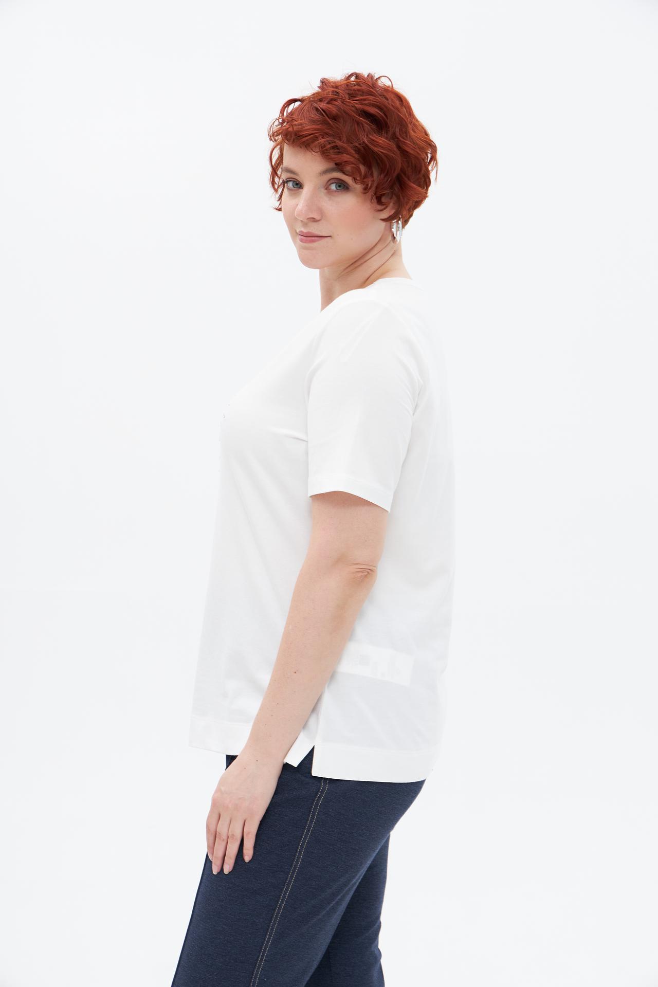 - Универсальность: Базовая белая футболка с ярким акцентом легко комбинируется с джинсами, брюками или юбками, создавая разнообразные повседневные и нарядные комплекты.
