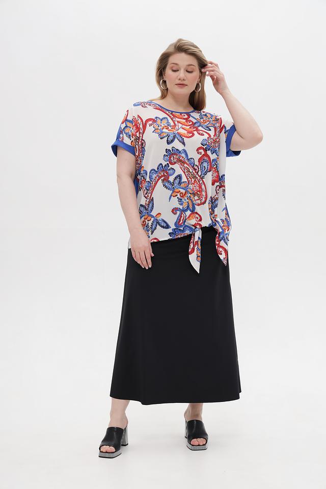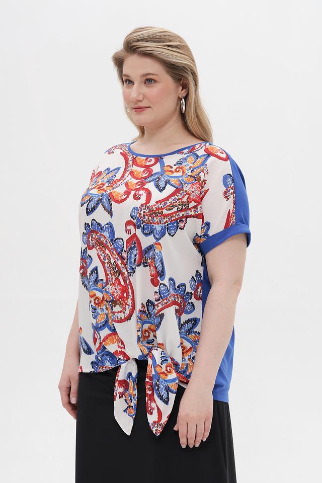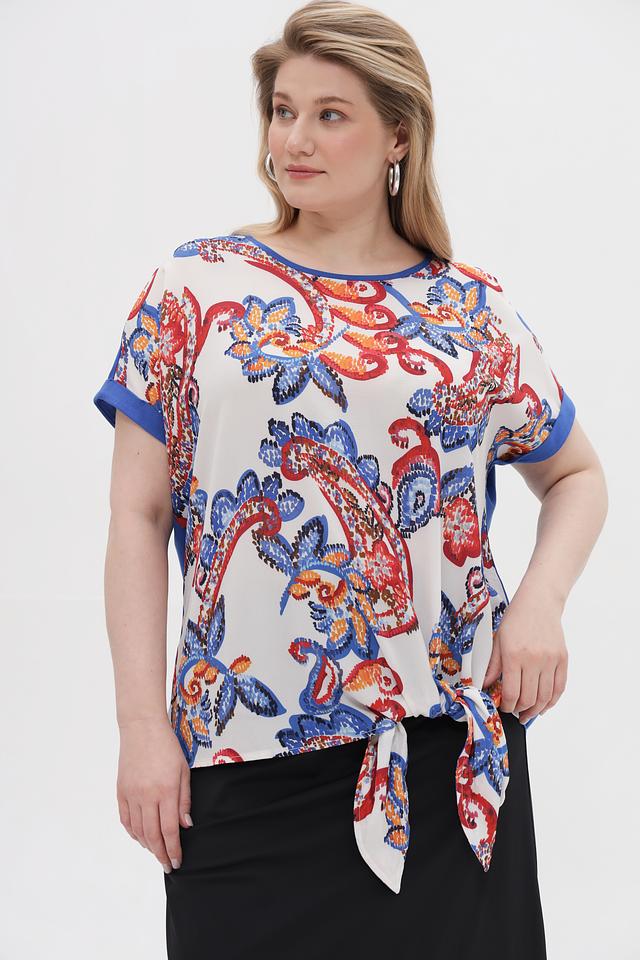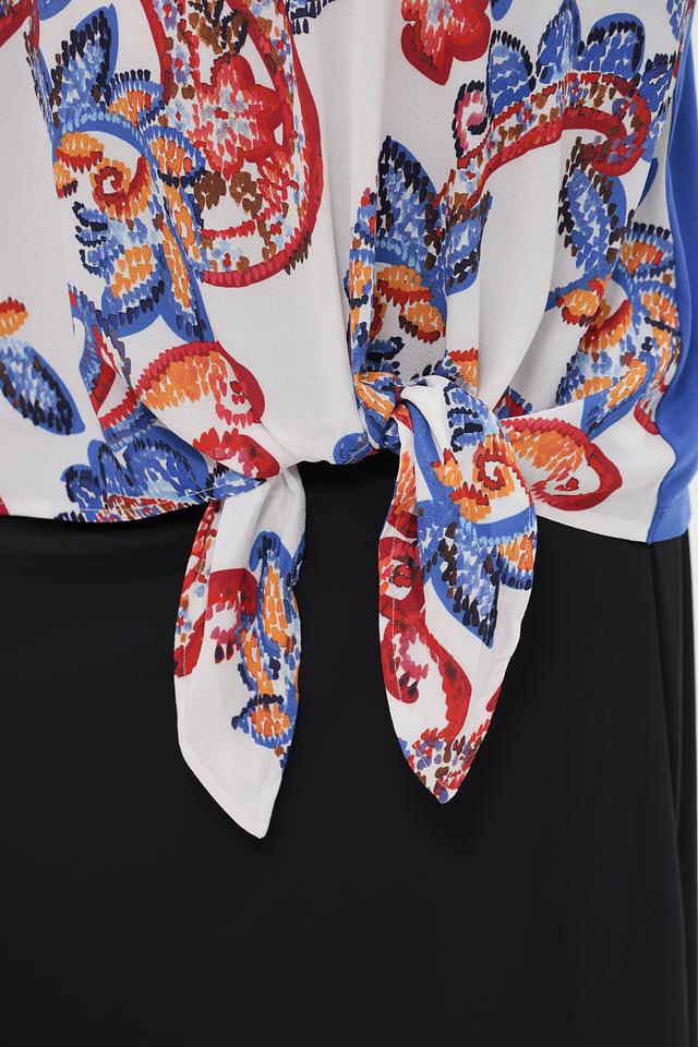 Блузка имеет свободный крой и короткие рукава с манжетами. Основной цвет – белый, но главным украшением является красочный цветочный принт в красных, синих и оранжевых тонах. Завязки на талии позволяют подчеркнуть фигуру и создать более женственный силуэт.