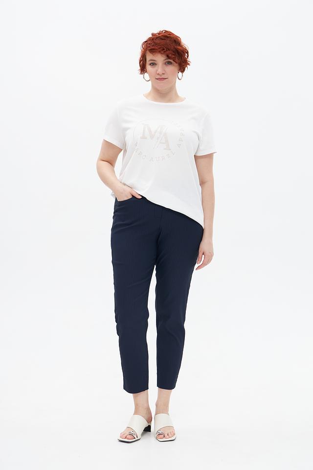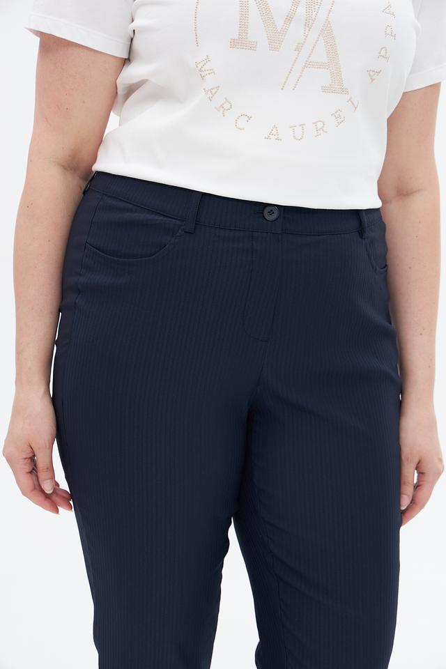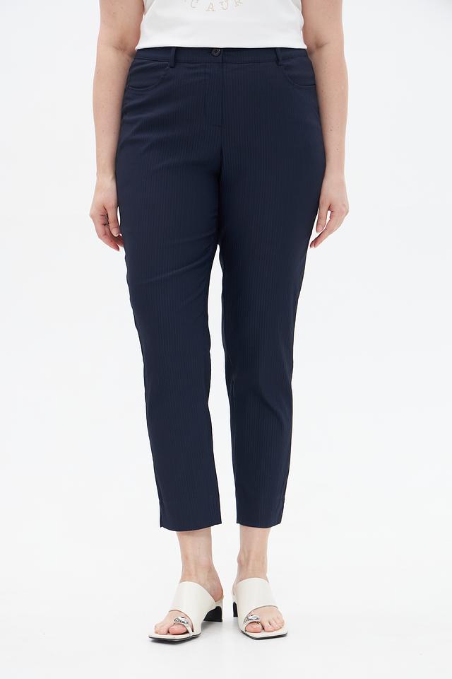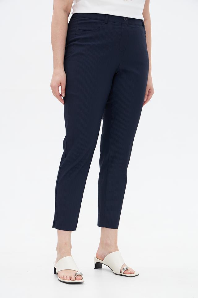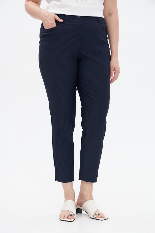 Представляем элегантные брюки от бренда Samoon, выполненные в классическом синем цвете с вертикальной полоской.