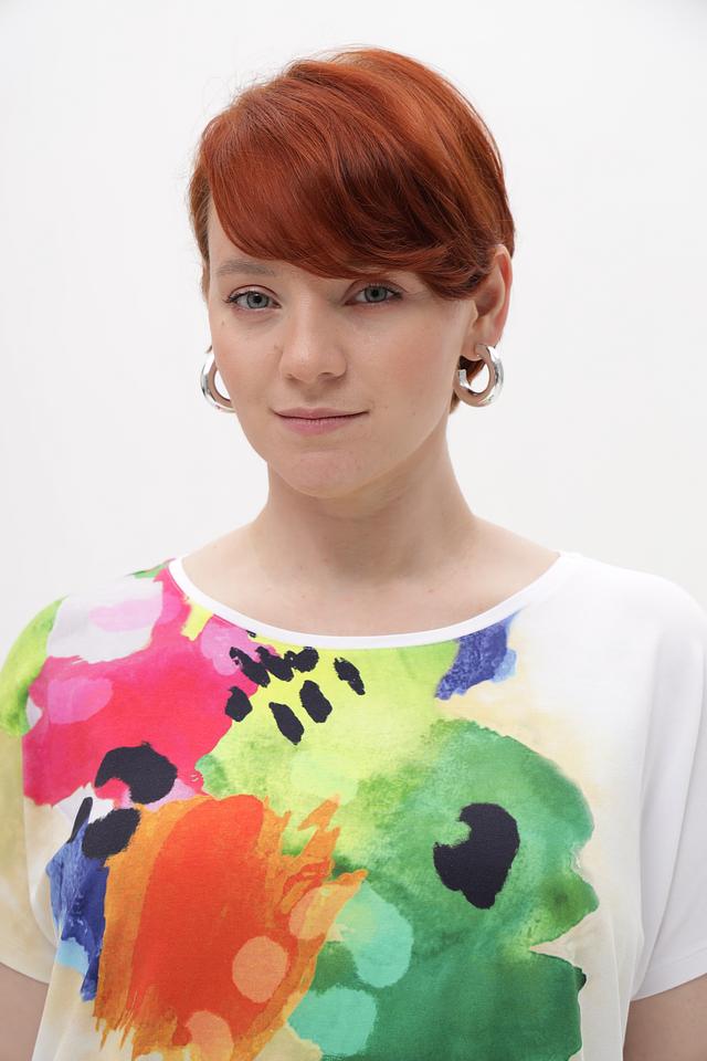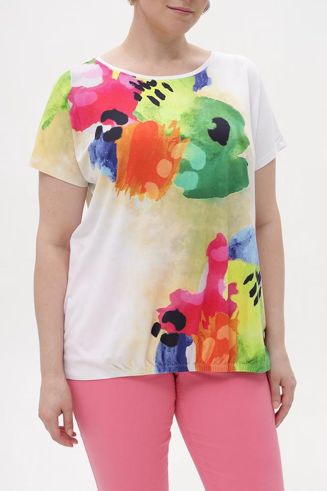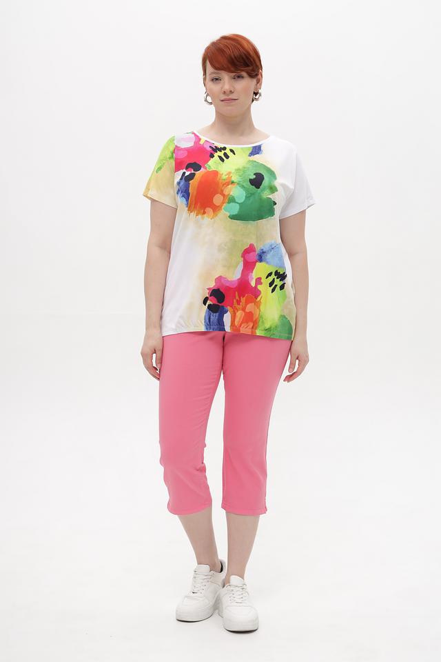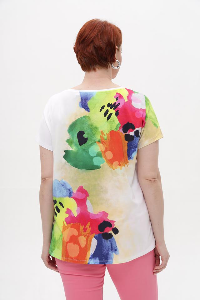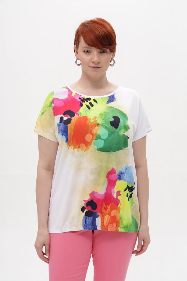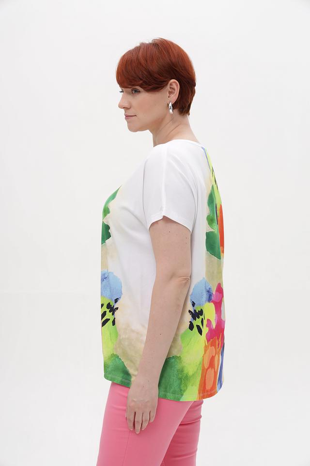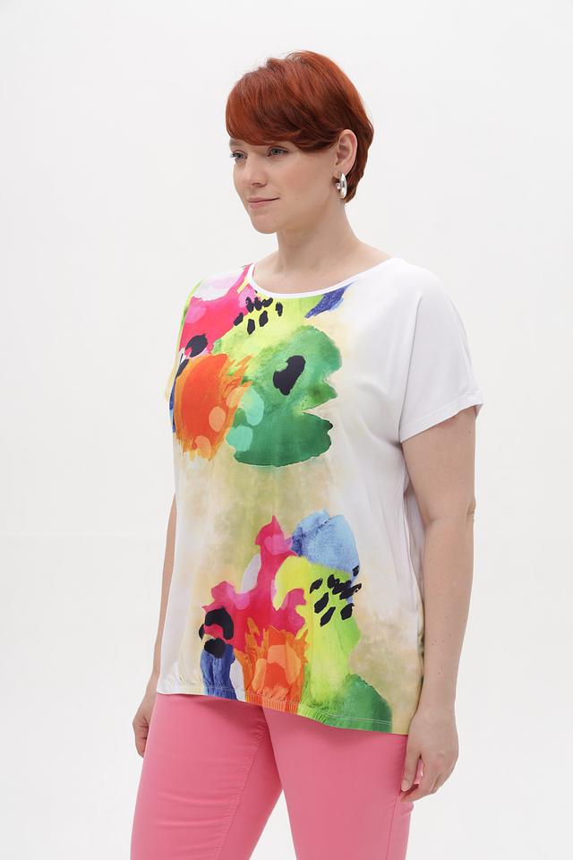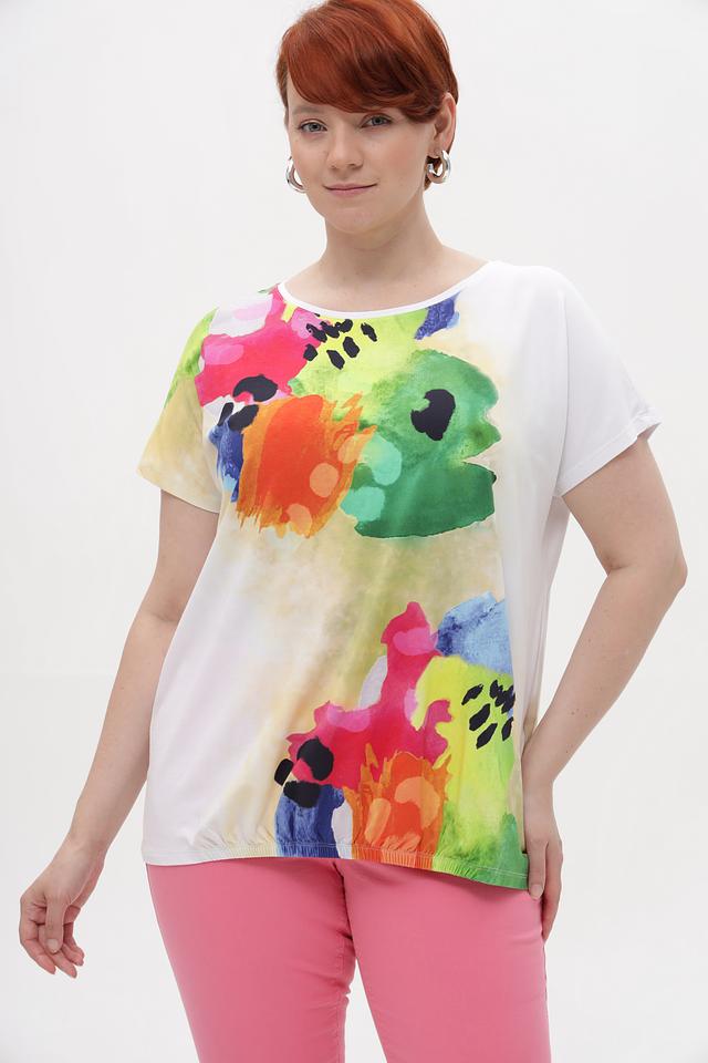 Основной цвет футболки – белый, но её украшает красочный принт, выполненный в технике акварели, с изображением ярких цветов. Принт покрывает основную часть изделия, придавая ему оригинальность и выразительность. Округлый вырез горловины и короткие рукава делают футболку универсальной и подходящей для различных случаев.