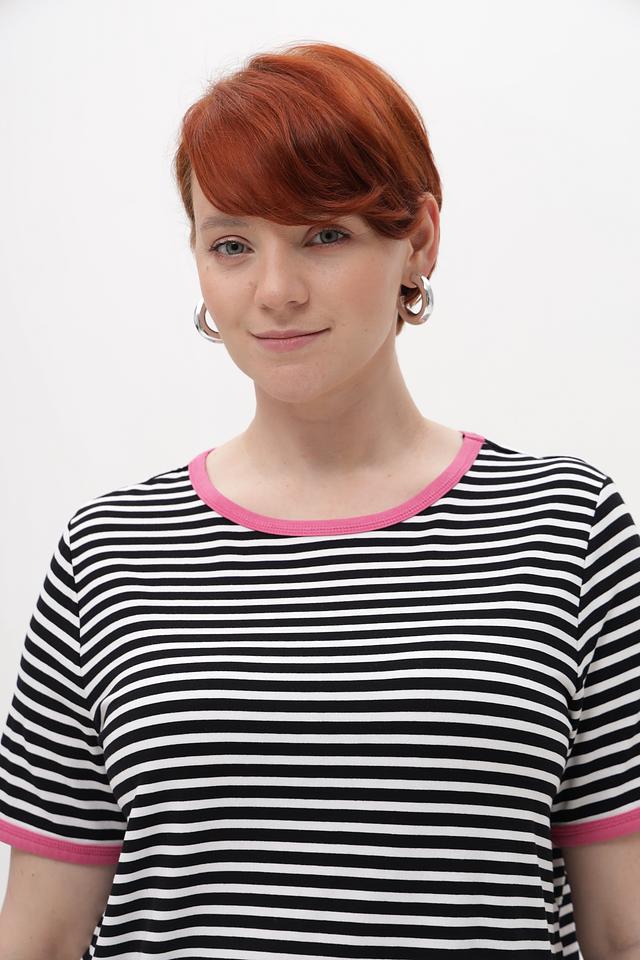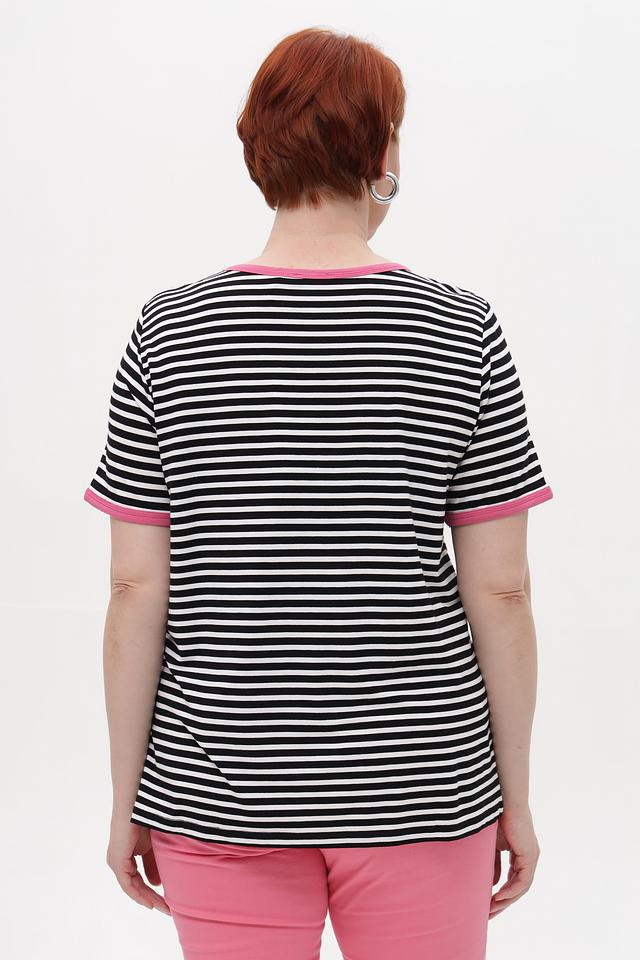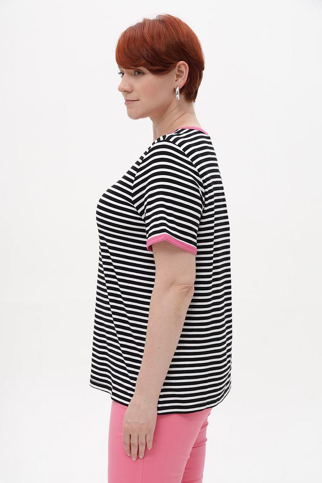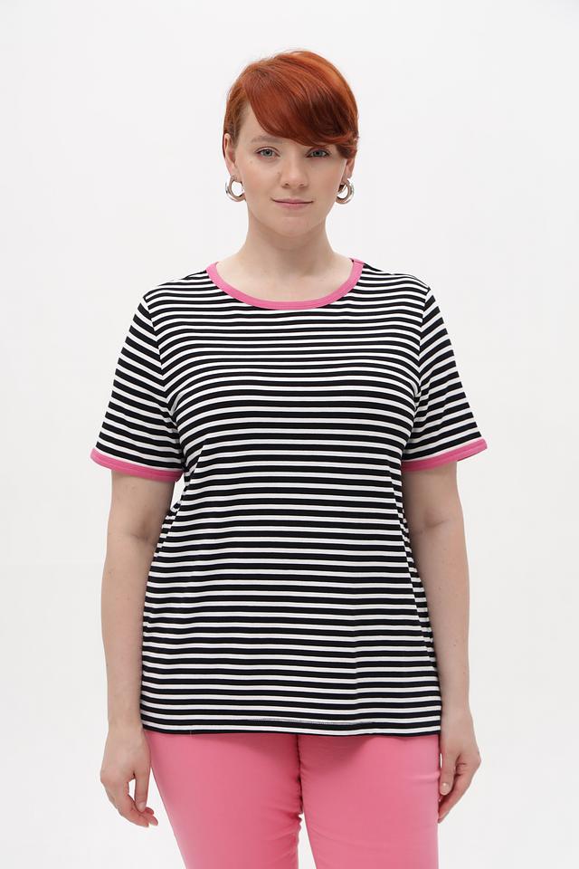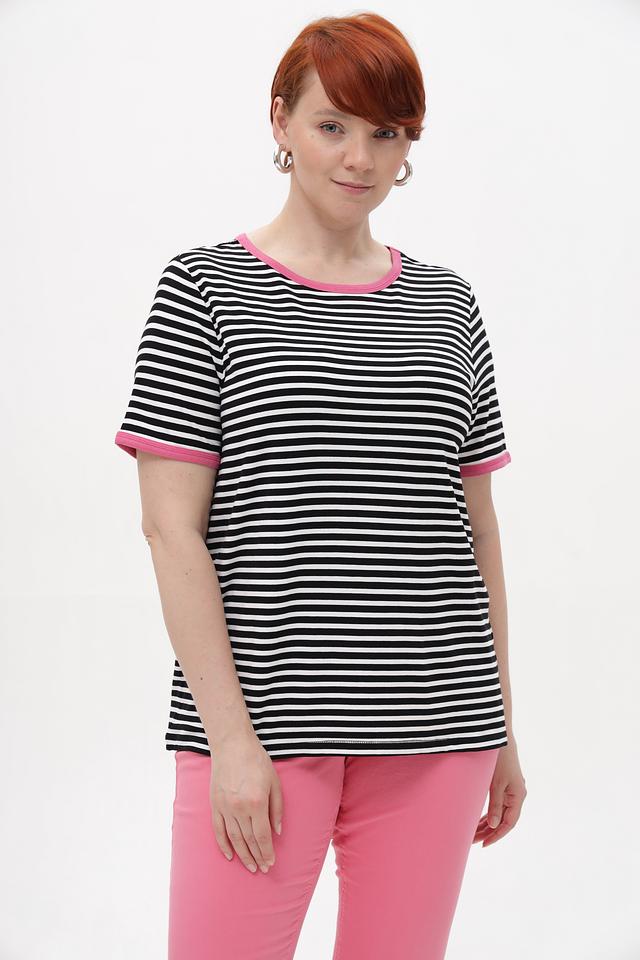 Женская футболка Samoon выполнена в классическую чёрно-белую полоску и дополнена розовой окантовкой горловины и рукавов. Изготовлена из мягкой вискозы с добавлением эластана для комфорта и свободы движений. Состав: вискоза 95%, эластан 5%