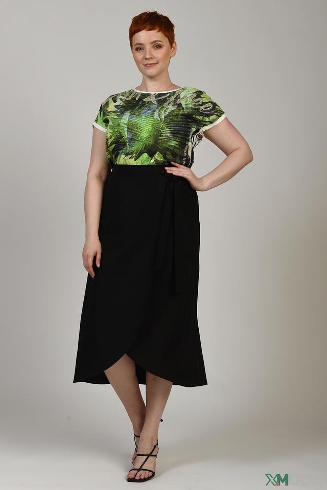 Юбка имеет длину миди и фасон с запахом, который визуально стройнит фигуру и подчеркивает талию. Завязки на талии позволяют регулировать посадку и создавать желаемый силуэт. Модель выполнена из приятной к телу ткани, состоящей из 60% вискозы и 40% полиэстера.