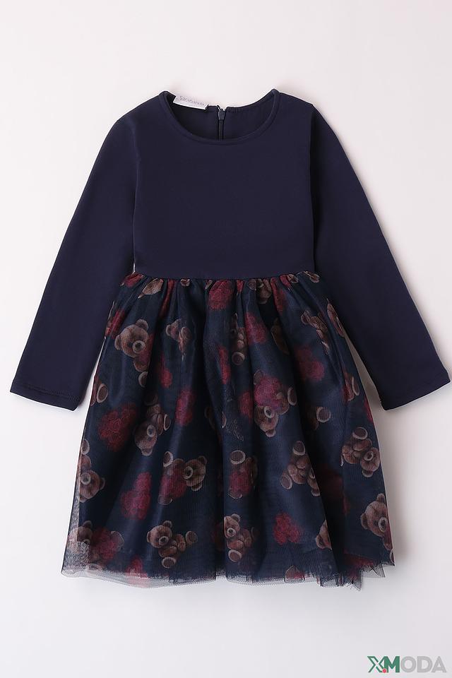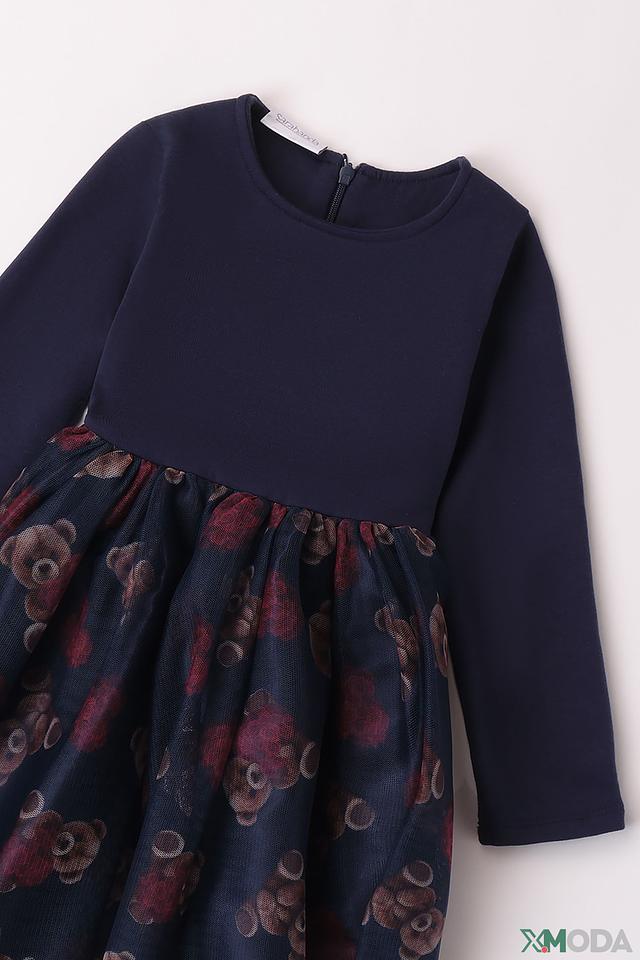 Платье Sarabanda для девочки, тёмно-синего цвета, с цветочным принтом и пышной юбкой из фатина. Модель с длинными рукавами и удобной посадкой идеально подойдёт для особых случаев и повседневной носки. Состав: хлопок 95%, эластан 5%