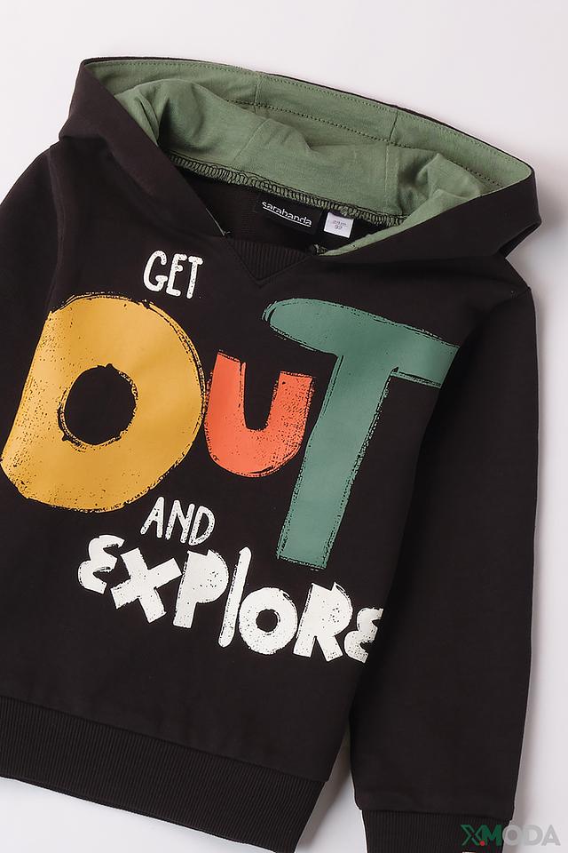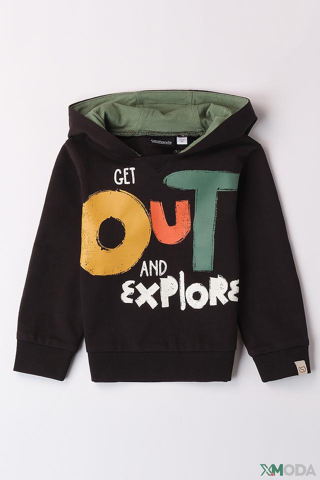 Чёрный джемпер от Sarabanda с ярким принтом "Get Out and Explore" станет отличным выбором для активного ребёнка. Изготовлен из 100% хлопка, обеспечивая комфорт и удобство в носке. Состав: хлопок 100%
