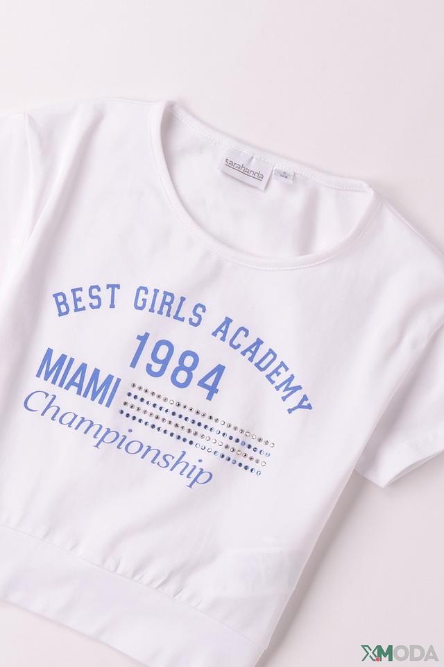 Белая футболка Sarabanda для девочки с ярким принтом "Best Girls Academy". Изготовлена из мягкого хлопка с добавлением эластана для комфорта и свободы движений. Состав: хлопок 95%, эластан 5%
