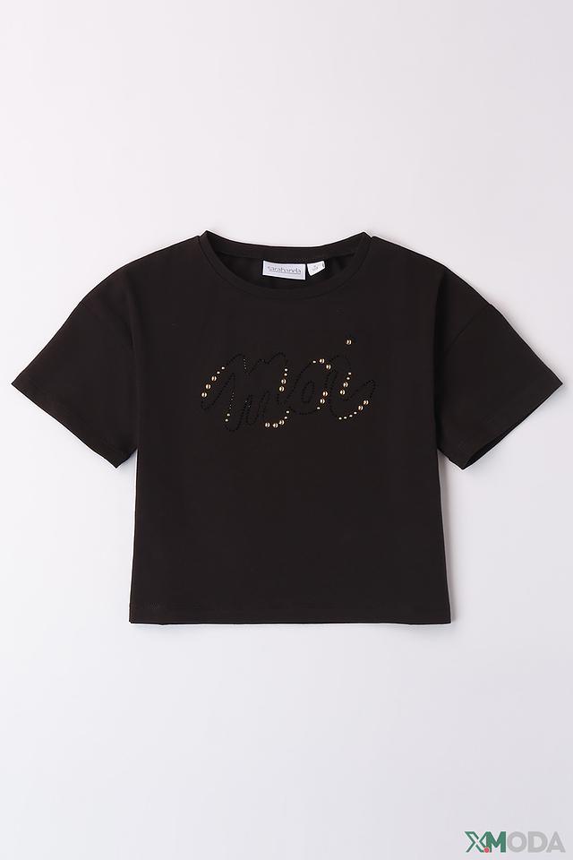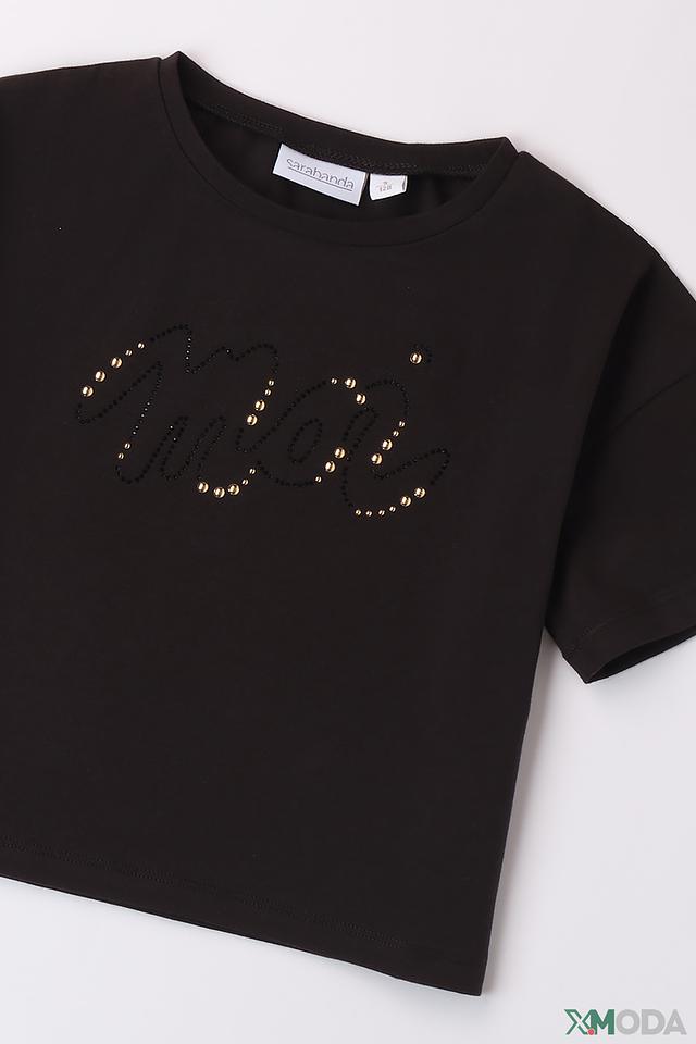 Чёрная футболка Sarabanda для девочек, украшенная стильным логотипом. Изготовлена из мягкого хлопка с добавлением эластана для комфорта и свободы движений. Состав: хлопок 95%, эластан 5%