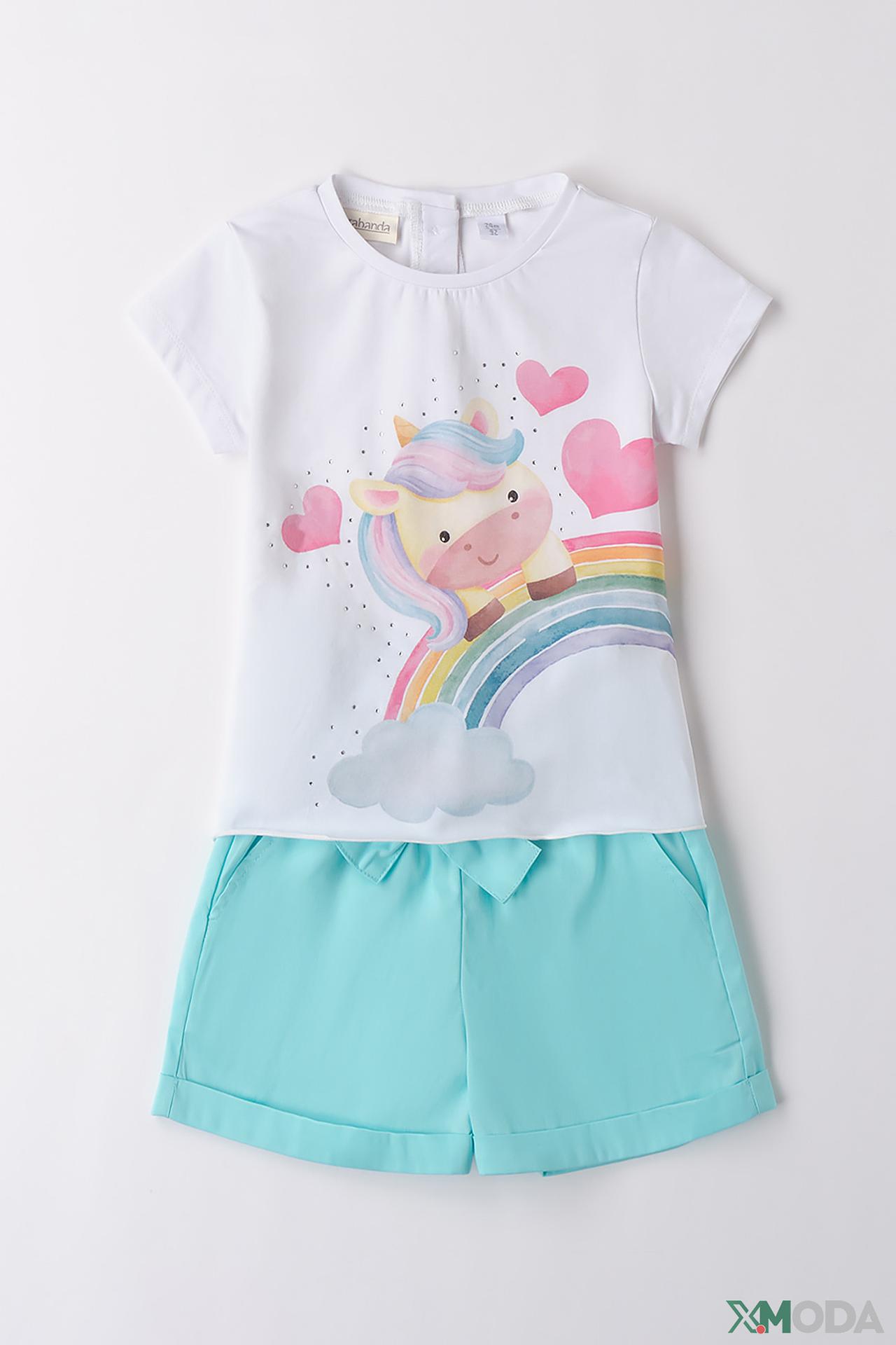 Очаровательный детский комплект Sarabanda — идеальный выбор для маленьких модниц, сочетающий в себе стиль, комфорт и игривость. Этот летний набор включает легкую футболку с коротким рукавом и удобные шорты, создавая идеальный образ для теплых дней и активных игр на свежем воздухе. Футболка украшена ярким и милым принтом единорога на фоне радуги, дополненным нежными розовыми сердечками и деликатными стразами, которые добавляют блеска и волшебства. Голубые шорты с декоративным бантиком и эластичным поясом обеспечивают идеальную посадку и свободу движений.