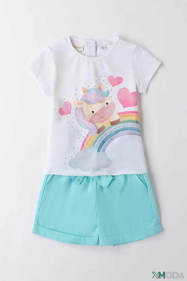 Футболка белого цвета, украшена красочным принтом с изображением милого единорога и розовыми сердечками. Короткие рукава и удобный крой обеспечивают свободу движений. Шорты мятного цвета, с эластичным поясом и небольшим пояском, дополняют образ.