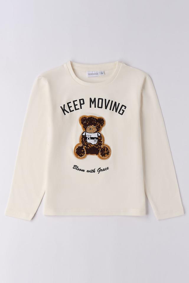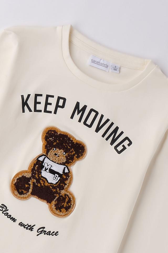 Этот очаровательный джемпер от Sarabanda станет прекрасным дополнением к гардеробу юной модницы. Выполненный в нежном кремовом цвете, он украшен ярким принтом милого медвежонка с надписью "KEEP MOVING" и "Bloom with Grace".