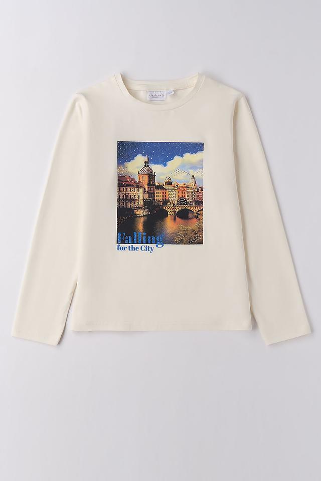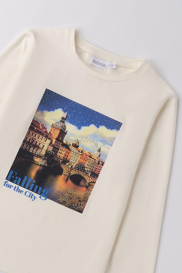 Джемпер Sarabanda для девочки, кремового цвета, с ярким принтом "Falling for the City". Изготовлен из мягкого хлопка с добавлением эластана для комфорта и свободы движений. Состав: хлопок 95%, эластан 5%