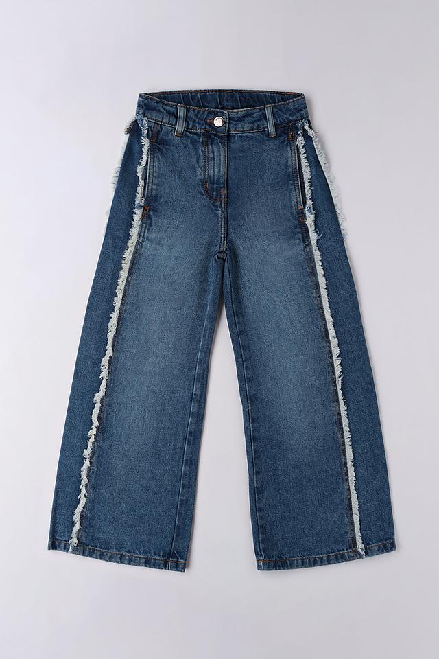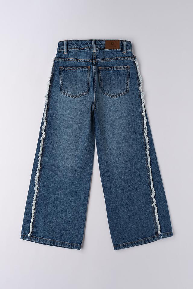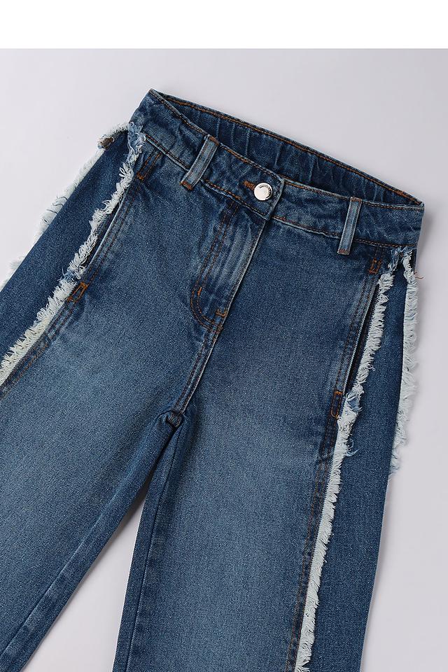 Джинсы имеют классический голубой цвет и высокую посадку, подчеркивающую талию. Широкие штанины позволяют свободно двигаться и создают современный силуэт. Оригинальным акцентом является декор из бахромы, расположенный по боковым швам, придающий образу неповторимый вид.